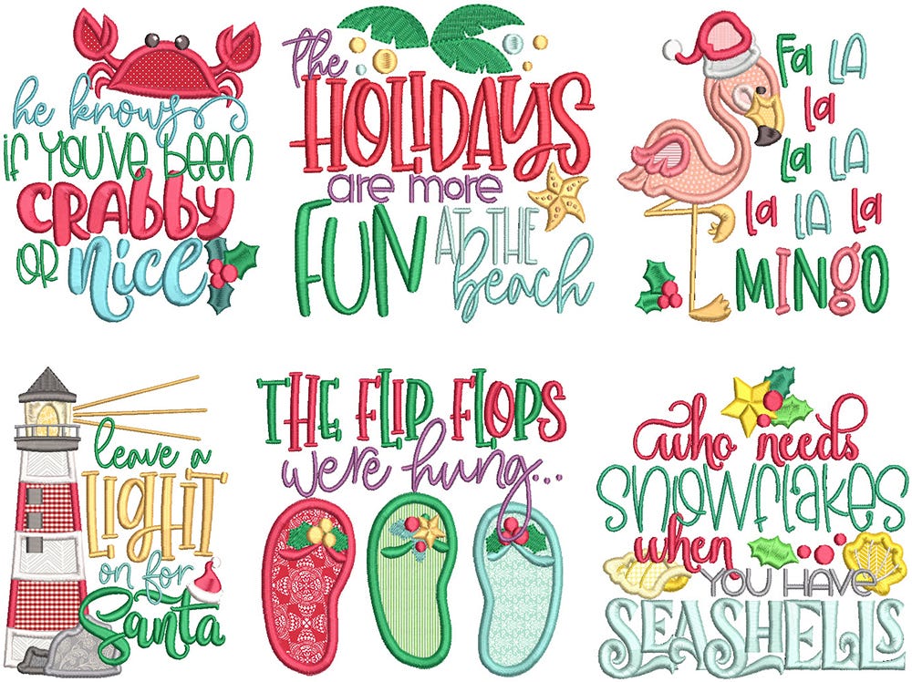 *Please note that the following designs contain applique components:Ā He knows if you've been crabby or nice / Leave a light on for Santa / The flip-flops were hung... / Who needs snowflakes when you have seashells / Fa la la la la mingo /Ā