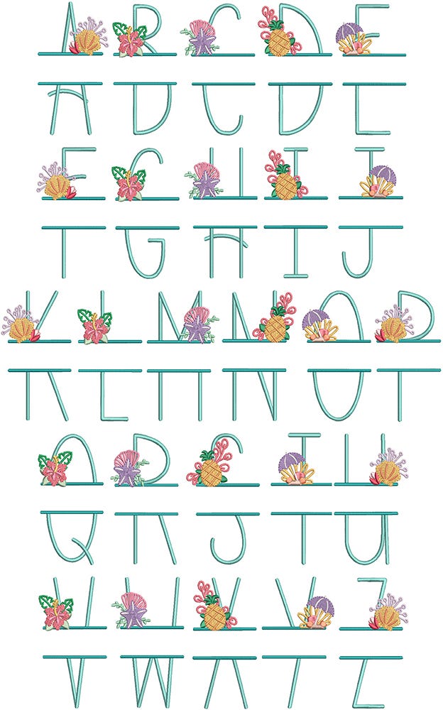 Our Beach Split Alphabet features a decorative satin stitch letter with embroidered beach-themed elements. Designed to be personalized with the font of your choice in embroidery editing software.