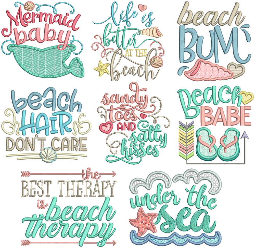 *Please note that the following designs contain applique components: Mermaid baby / Beach bum / Sandy toes and salty kisses / Beach babe / Under the sea