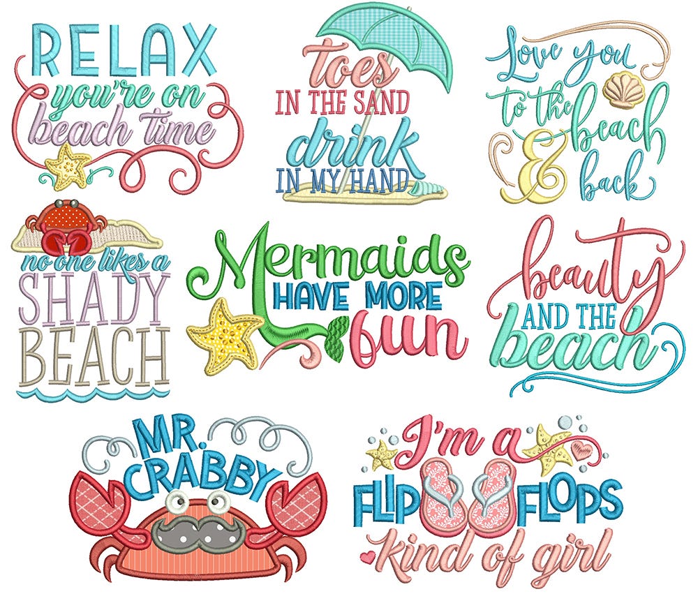 *Please note that the following designs contain applique components:Ā Toes in the sand drink in my hand / Mermaids have more fun / No one like a shady beach / Mr. Crabby / I'm a flip flops kind of girl / Relax you're on beach time /Ā