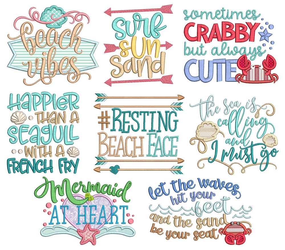 *Please note that the following designs contain applique components:Ā Beach Vibe / Sometimes crabby but always cute / The sea is calling and I must go / Mermaid at heart / Let the waves hit your feet and the sand be your seat /Ā