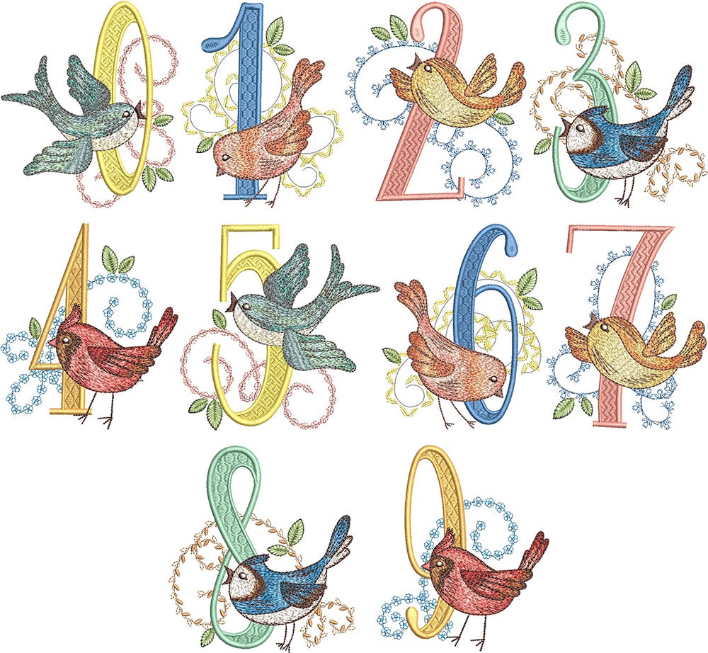 This number set is embroidery-only: each decorative fill stitch number has a bird that features multiple color layers of lighter density fill to create a blended, variegated, textured look. There is one file per number, as pictured.