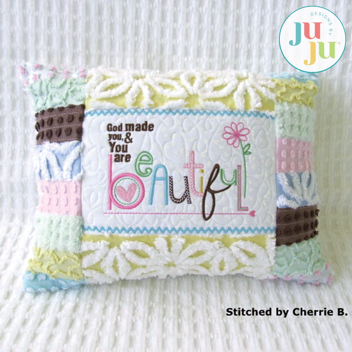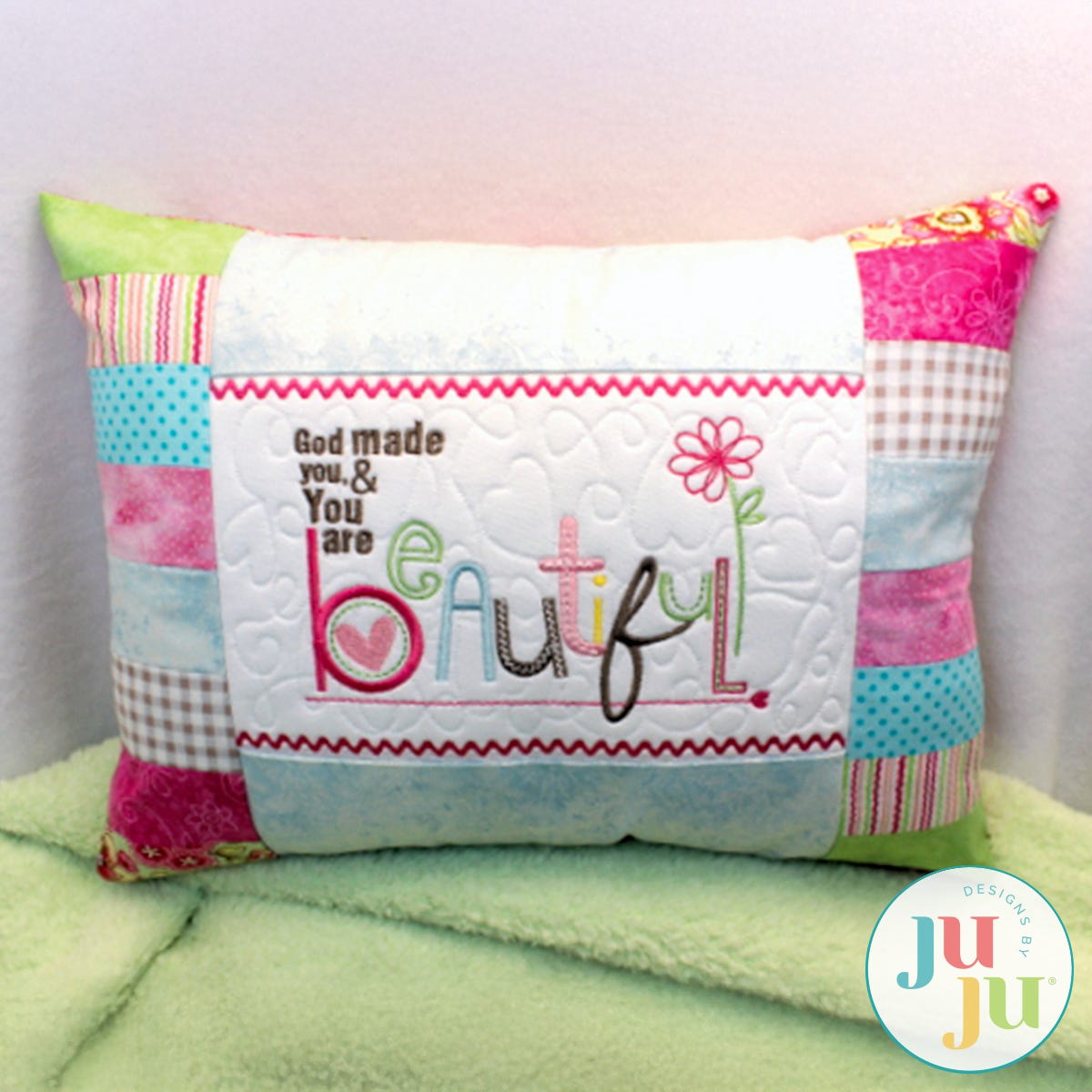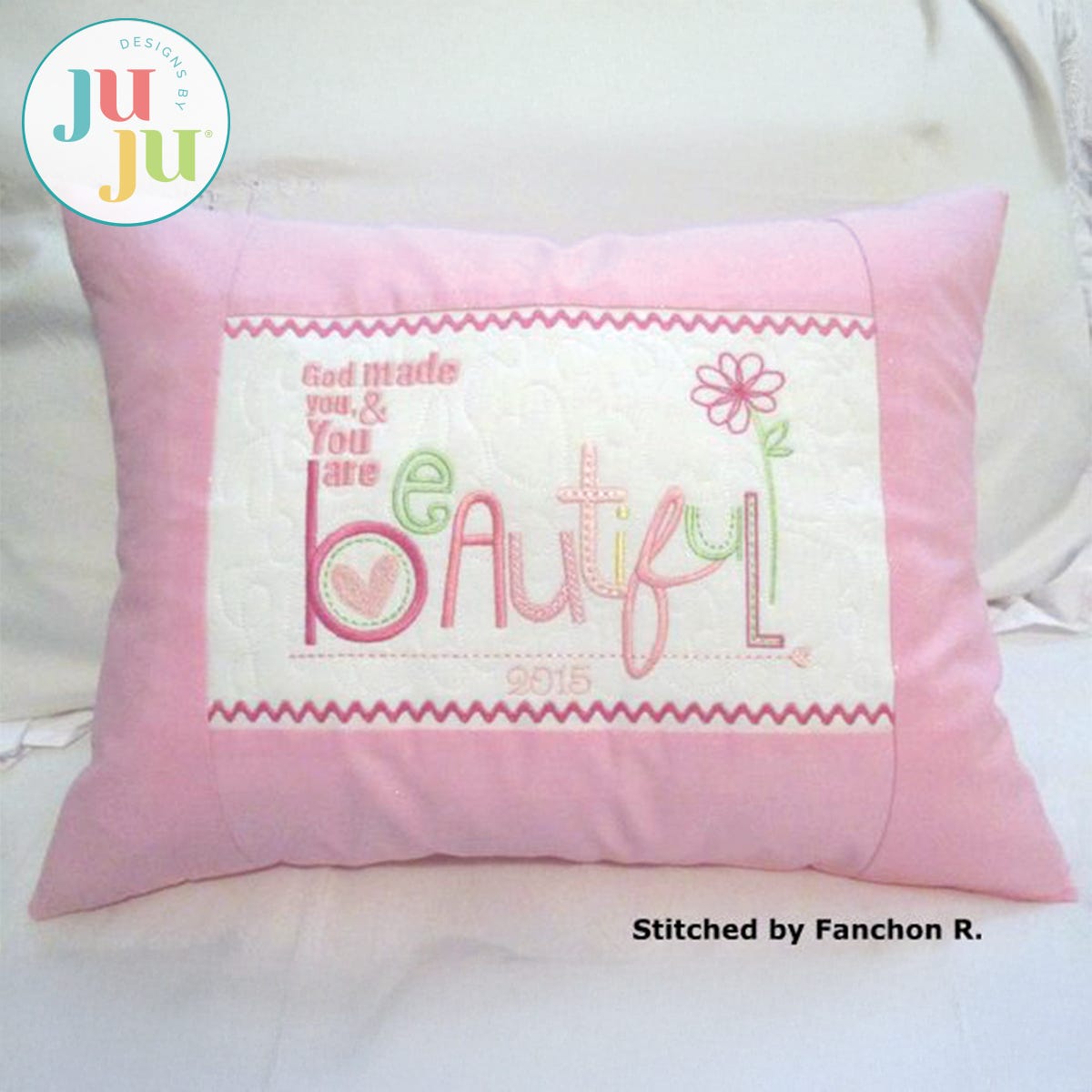 This partial in the hoop project uses a pre-made 12x16" pillow form. Some basic machine sewing is required to complete this project . The pillow is completed with a Velcro closure in the back. This closure is completely done in the hoop. A total of two hoopings are required. The center of the pillow front is motif quilted and the borders are attached during the embroidery process. You may use a strip pieced border, as shown, or just make the side borders from one fabric. Instructions for strip piecing are included. Ricrac is also part of the embroidery. There is room for personalization of the pillow. You will also receive the pillow with the design centred, so no name insertion is needed. In all, you are getting 3 stitch files (Velcro closure; front with design centred; design off center to facilitate name insertion.)
