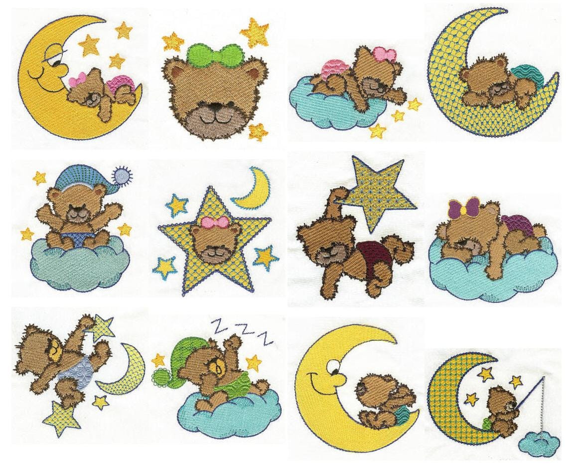 These precious little bedtime bears will just charm your socks off as you sew them onto baby items, nursery decor, quilts, clothing and more! Use them on a special blankie for baby or to embellish something for that perfect shower gift