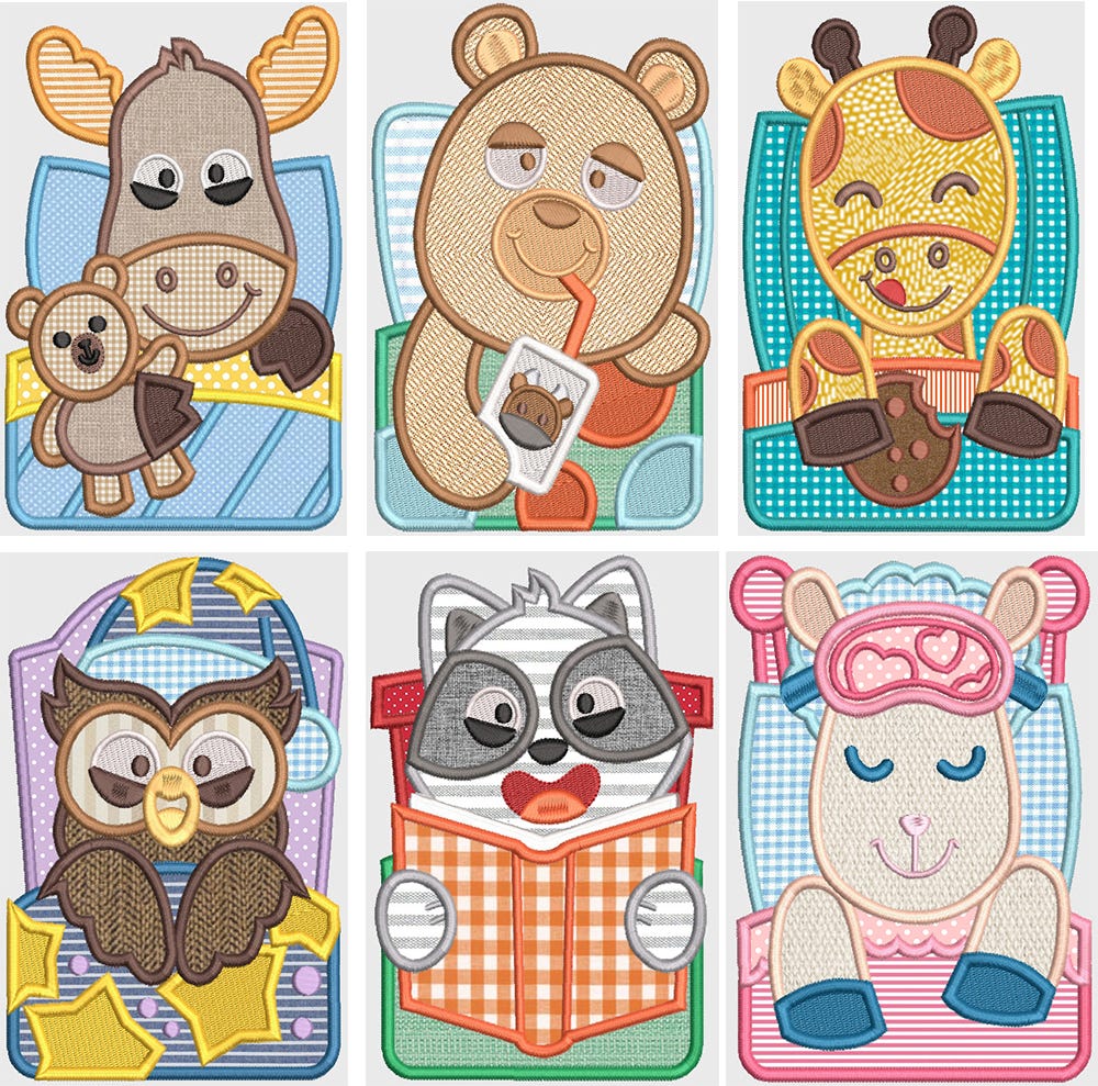 6 sweet and sleepy bedtime animals in applique!