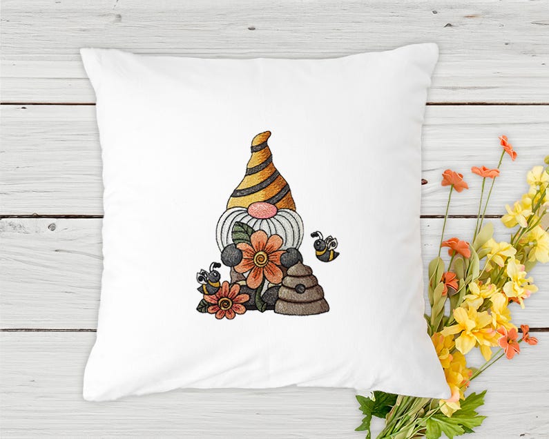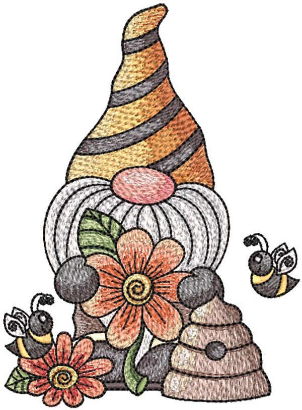 This gnome dressed like a bee is hanging out at the hive with his pals! This single design features multiple color layers of lighter density fill to create a blended, variegated, textured look.