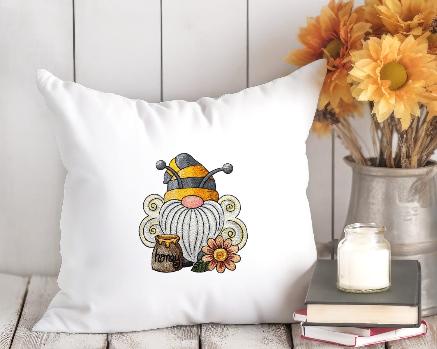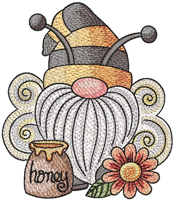 This gnome loves honey so much he's dressed like a bee! This single design features multiple color layers of lighter density fill to create a blended, variegated, textured look.