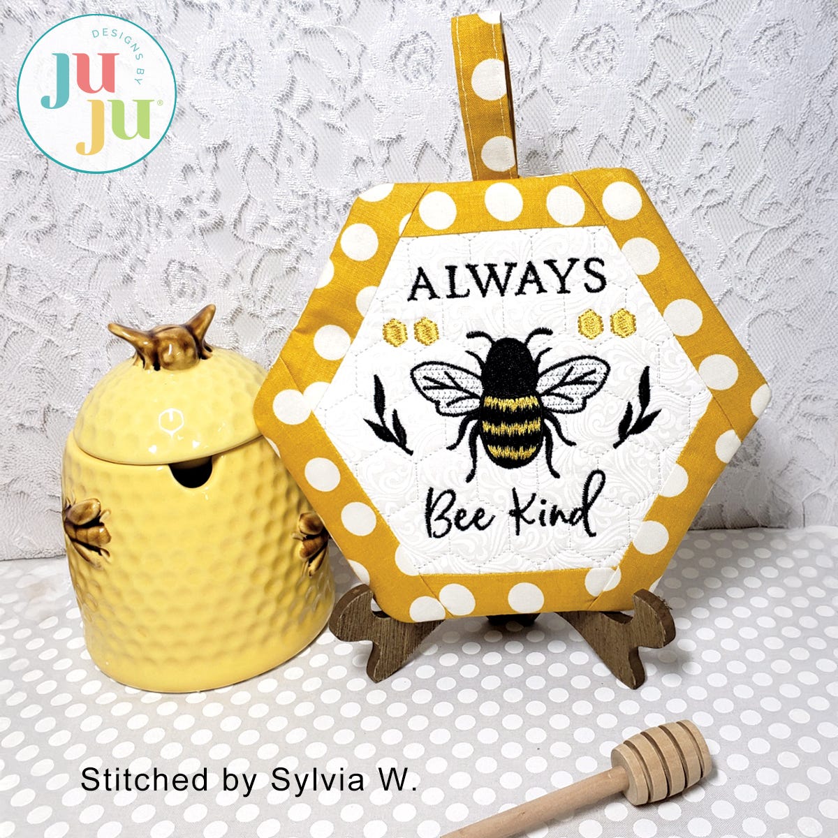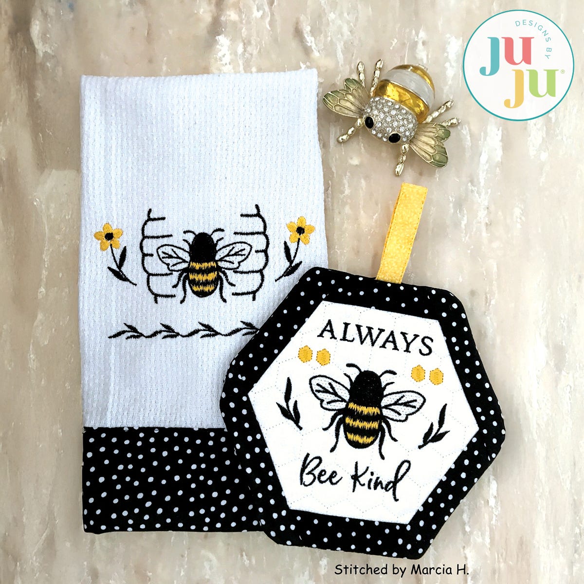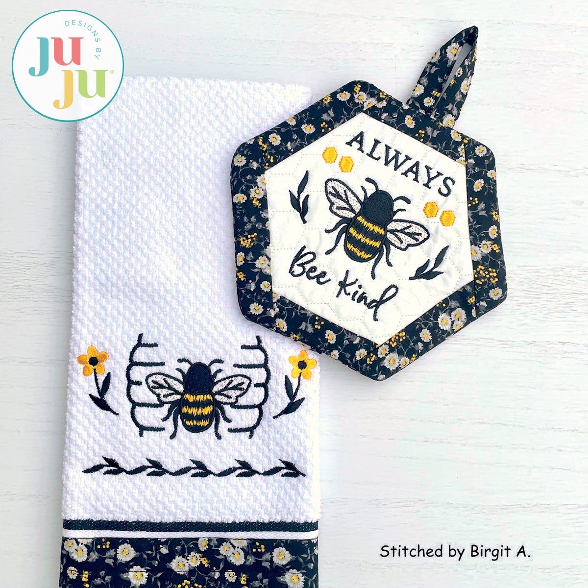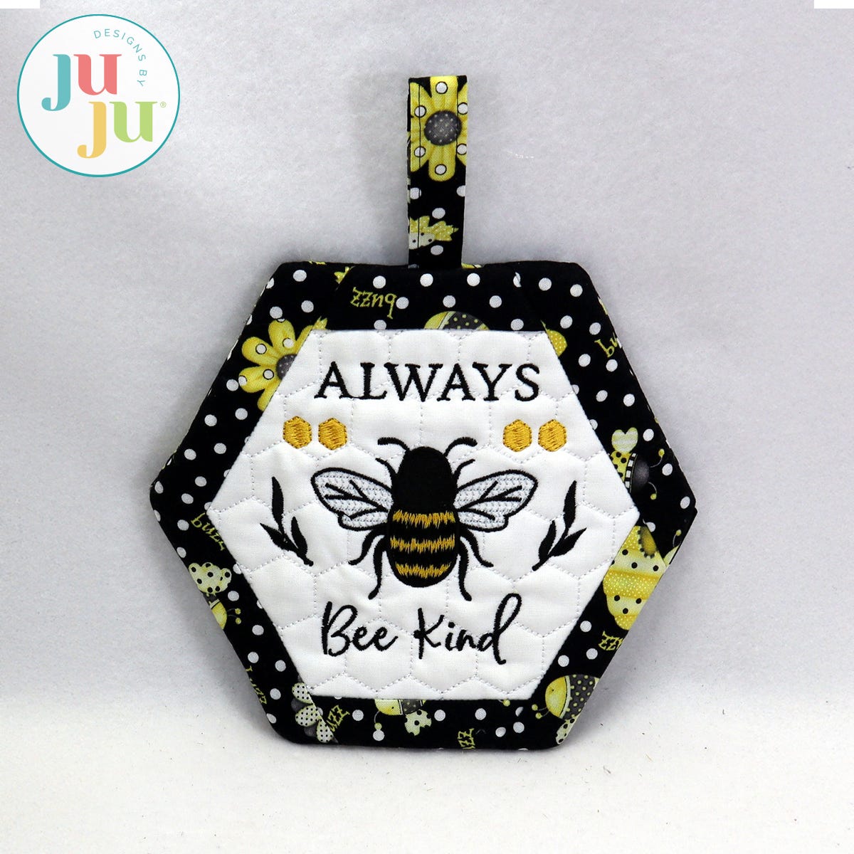 Formats included: DST, EXP, HUS, JEF, PES, VIP, VP3, XXX. Please note ART, PCS and SEW are not available.Pot holder Finished size: 7.75x6.75” (without loop)