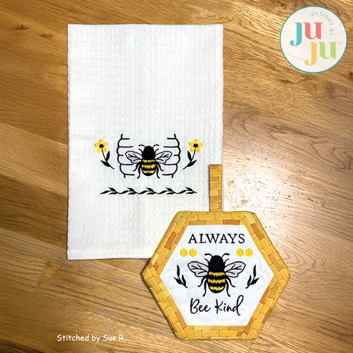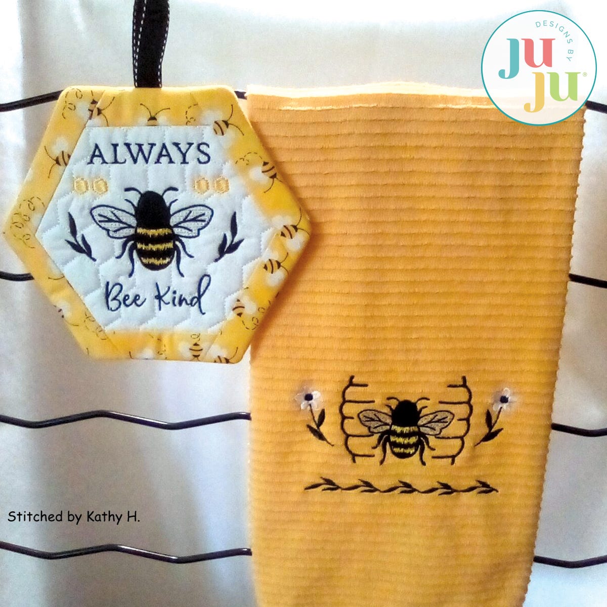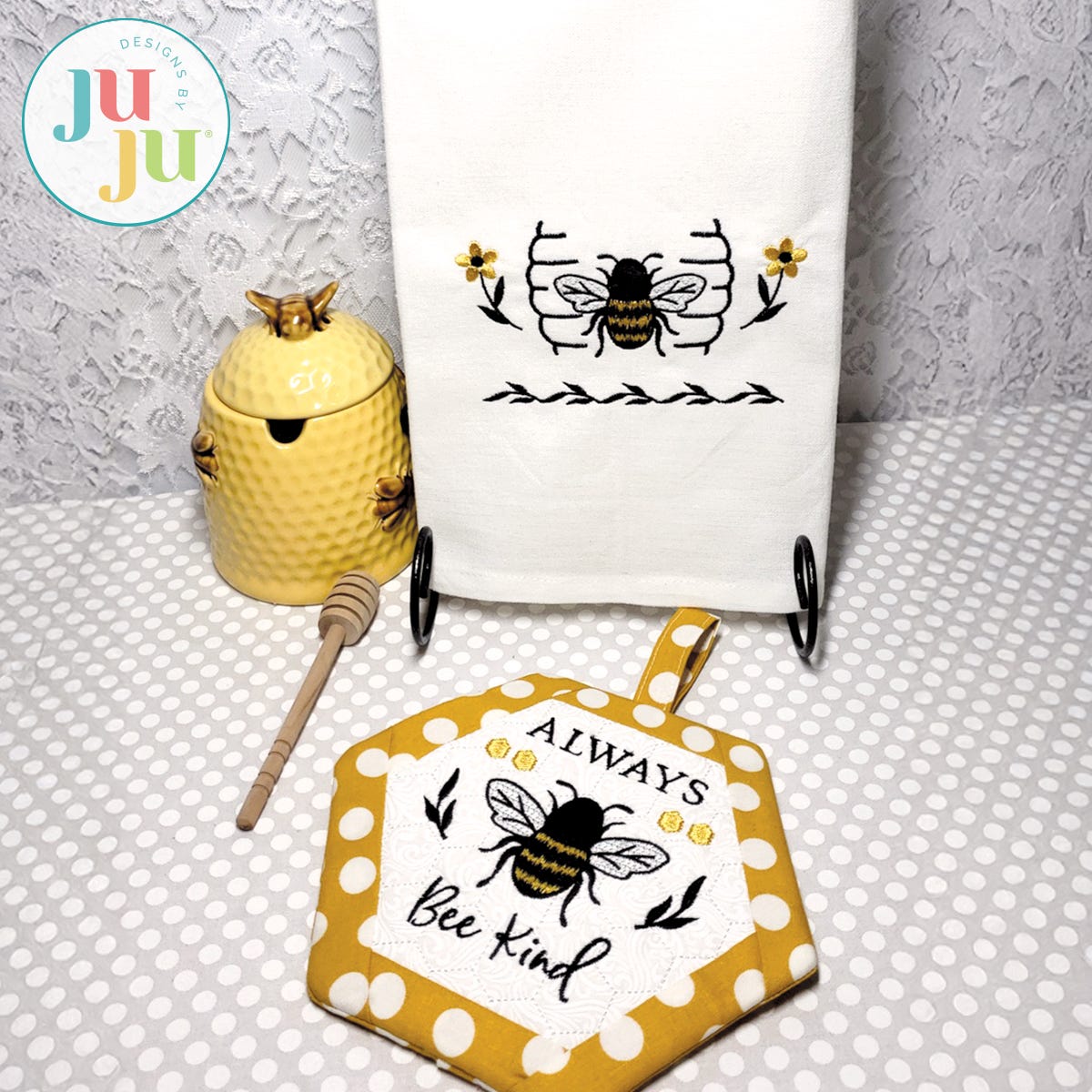 This set of bee themed potholder and towel design will make a great hostess gift and cheer up any kitchen.