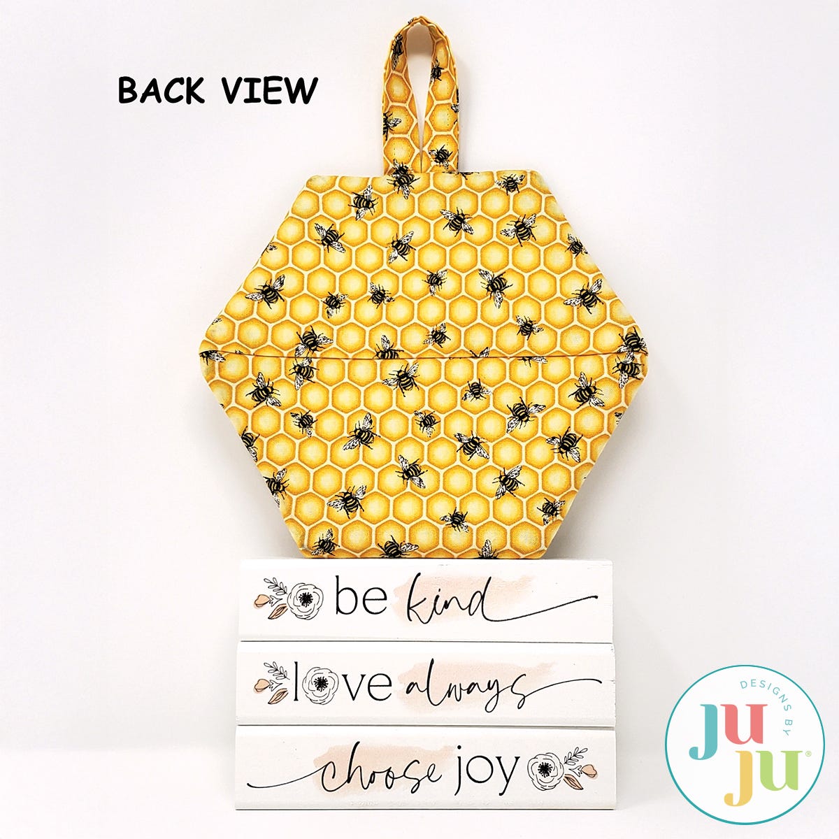 The center of this potholder is quilted with a honeycomb pattern and the border strips are applied in the stitch and flip method. The top loop can be stitched on the sewing machine or a ribbon loop could be used instead. Thorough and detailed instructions as well as many photos are part of your download. No hand or sewing machine stitching required. Sewing machine stitching is optional for the loop.
