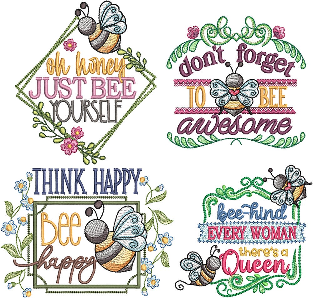 Stitch something as sweet as honey! Our Bee Word Art Set 1 has four BEE-utiful embroidered sayings, each embellished with lovely frames and floral accents.