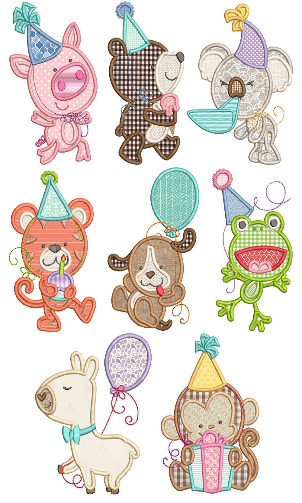 8 sweet and fun āparty animalsā in applique!