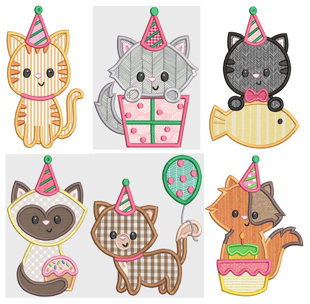 6 super sweet birthday kitties in applique!