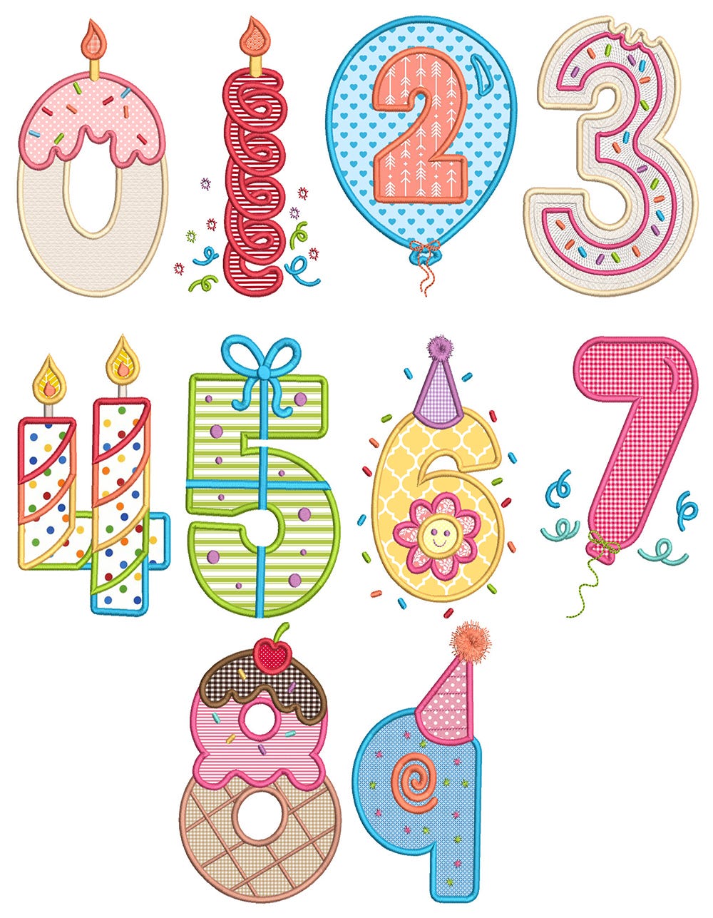 10 cute and oh-so-fun birthday numbers (0-9) in applique!