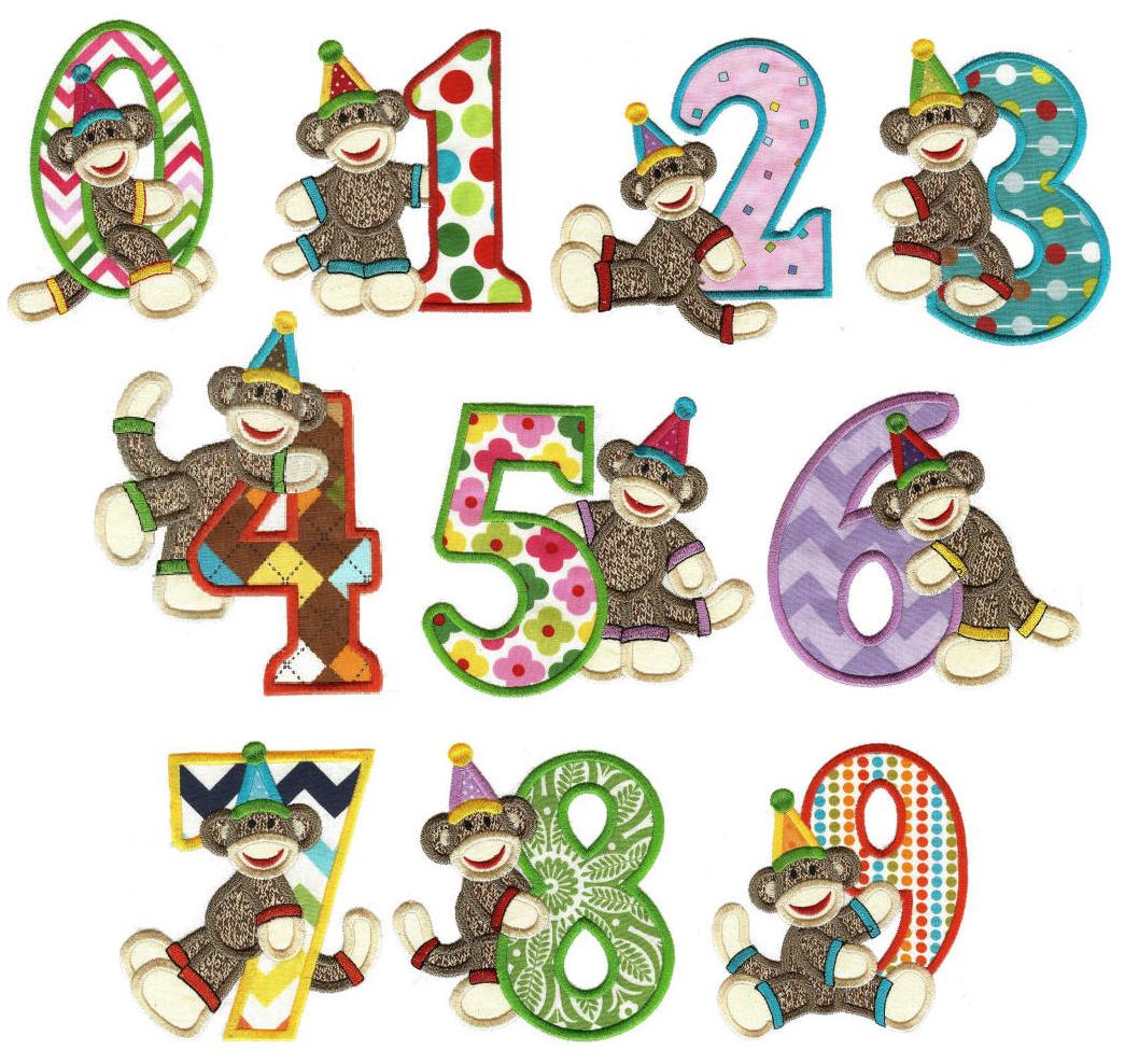 We have been promising our beloved sock monkeys with numbers, and here they are! Numbers 0-9 in applique. Each sock monkey applique is wearing a little birthday hat. These are perfect for birthday shirts and bibs! There are 4 sizes included for each design.