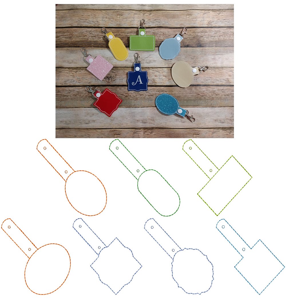Your customizing options are endless with our blank shapes in the hoop key fobs! Each set comes with 7 differently shaped blank key fobs. Font not included.