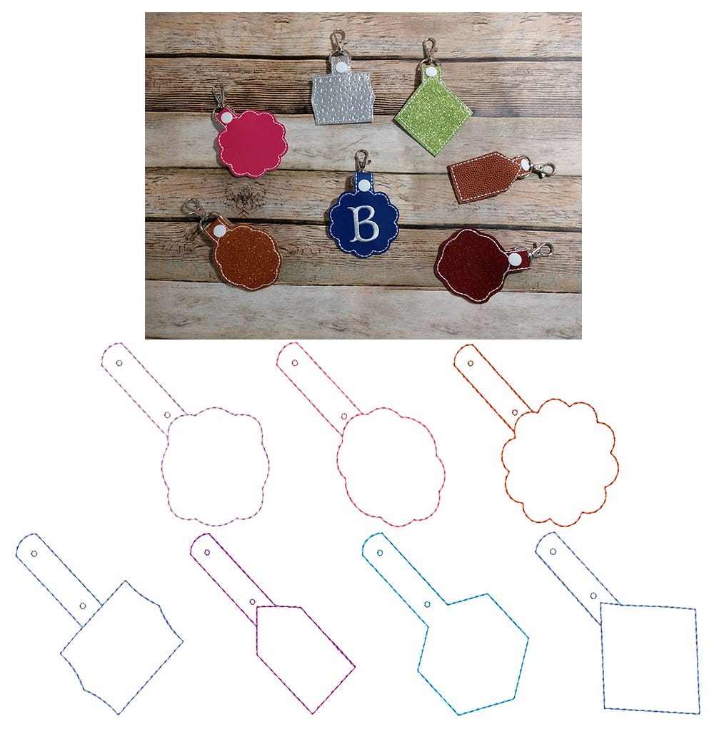Your customizing options are endless with our blank shapes in the hoop key fobs! Each set comes with 7 differently shaped blank key fobs. Font not included.