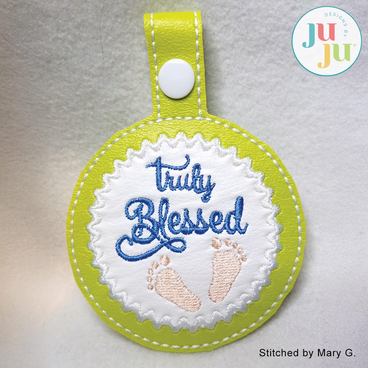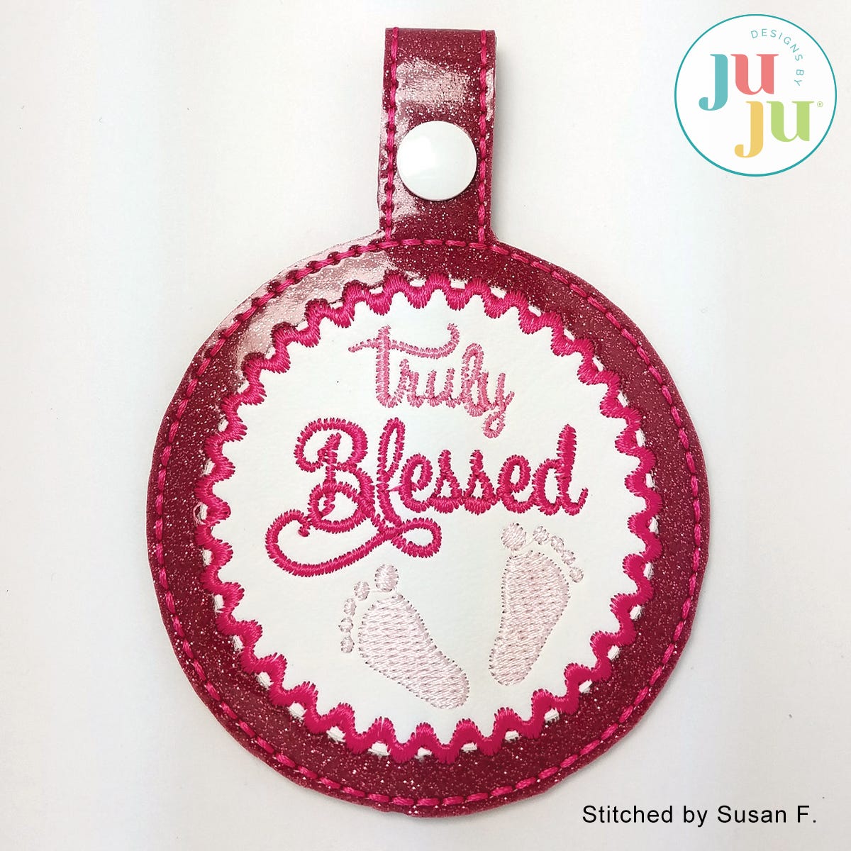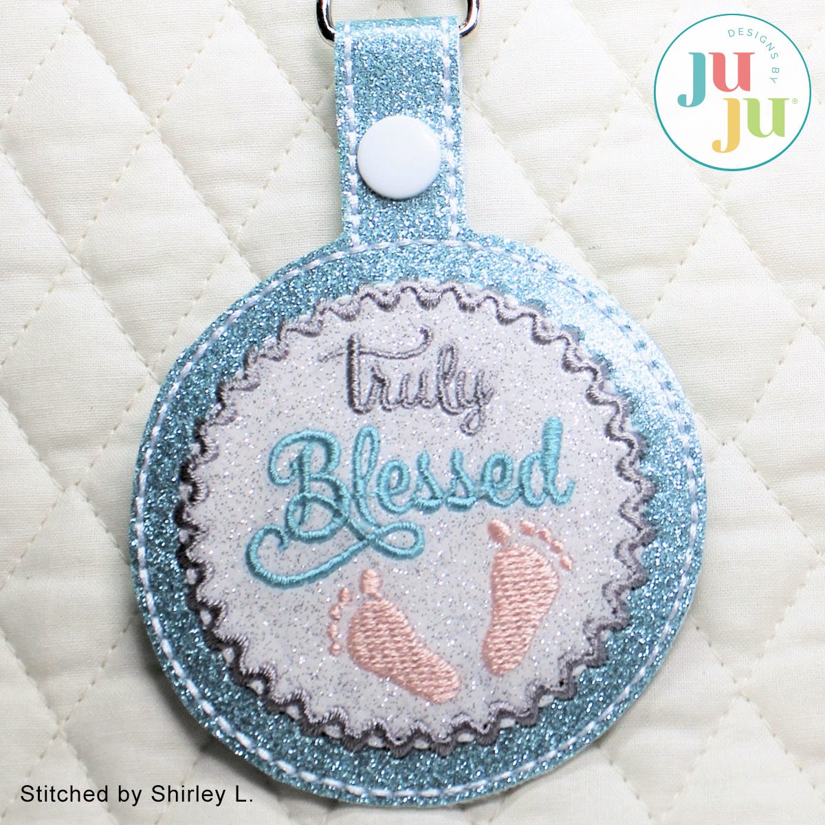 What a fun design and it's so quick to stitch! Great little addition to a baby shower gift. Can even be used as a key fob or attach to diaper bag. I am sure you can think of other uses as well.