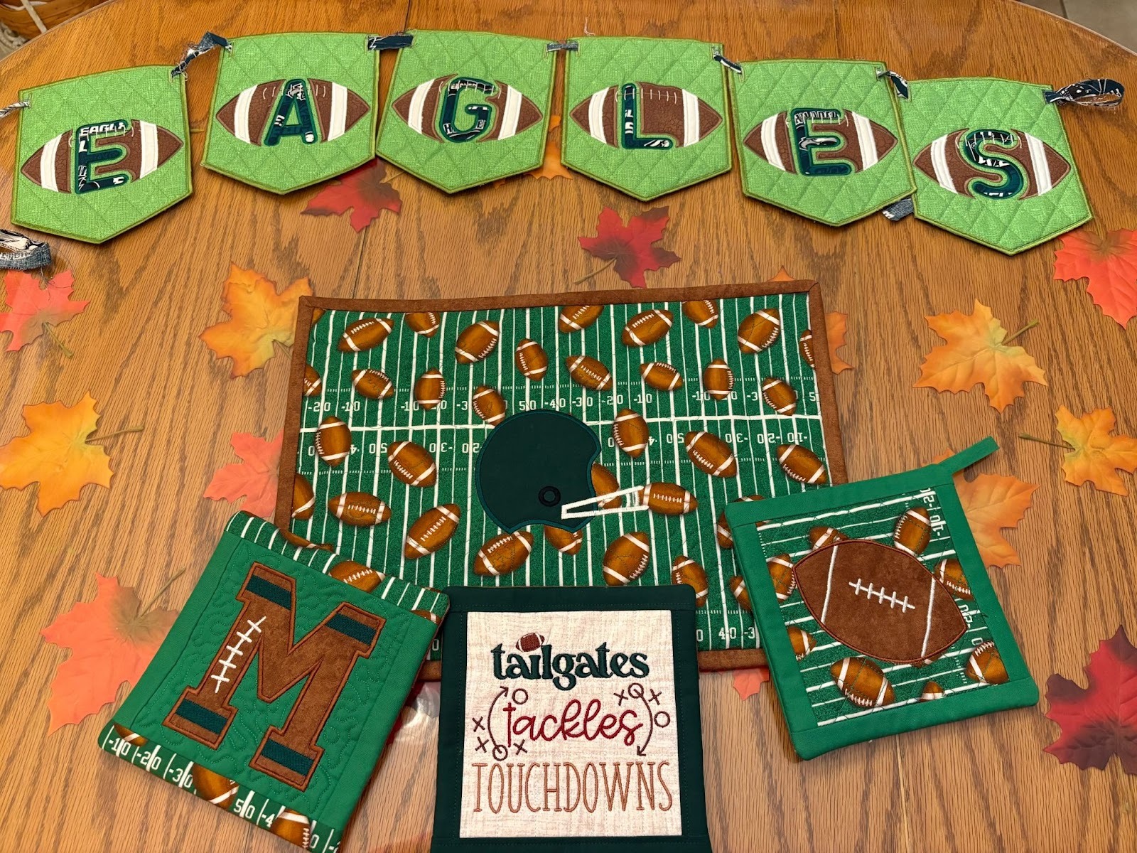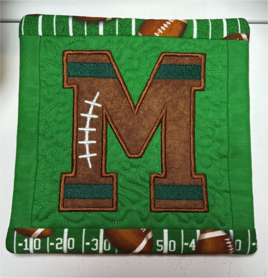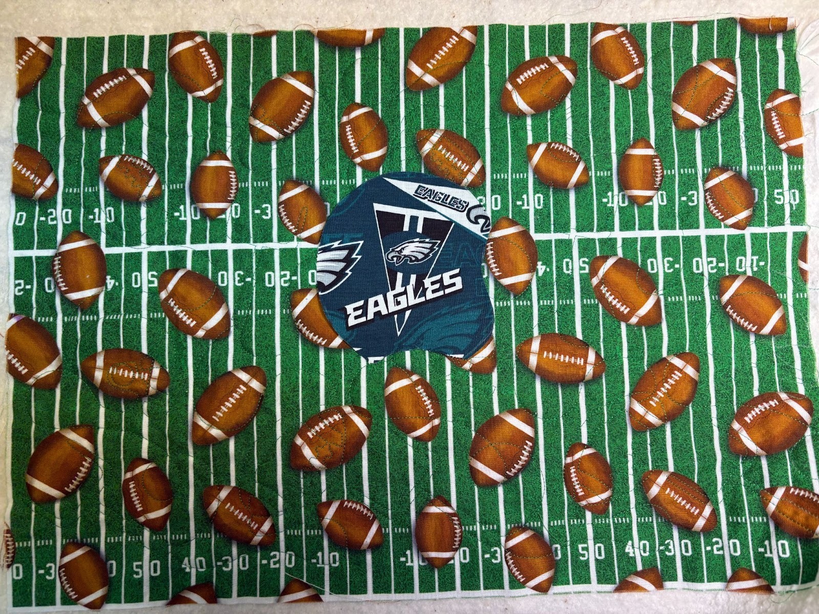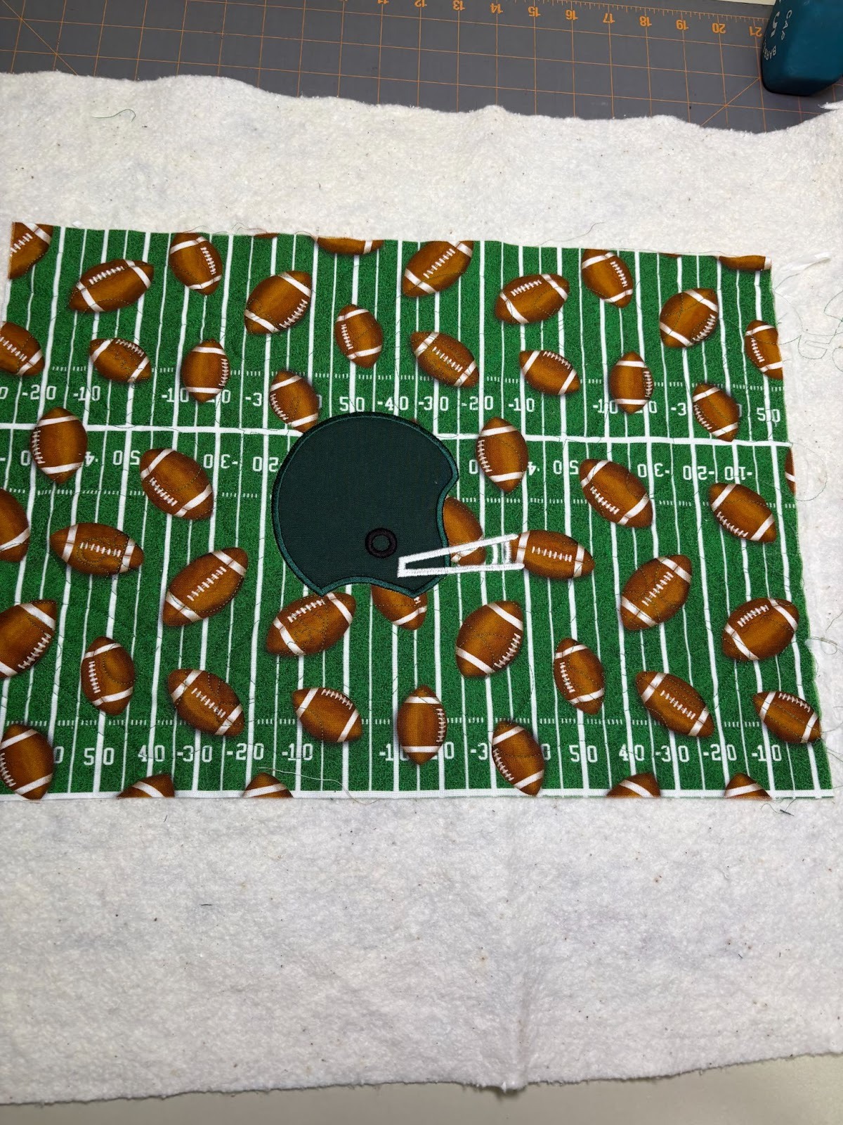 The Football Helmet Applique decorates the center of my trivet. I really wanted to use some of the Eagles fabric I had left over from making this Eagles banner last year. However, after taking some photos and looking at them, and even cutting out the shape of the helmet from the fabric, I decided there wasn’t enough contrast for it to look good. I found the center of my trivet and stitched out the football helmet in a solid dark green.