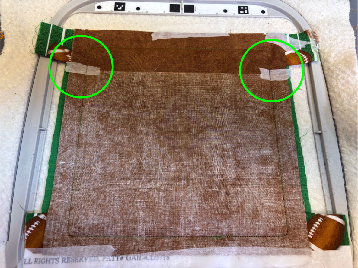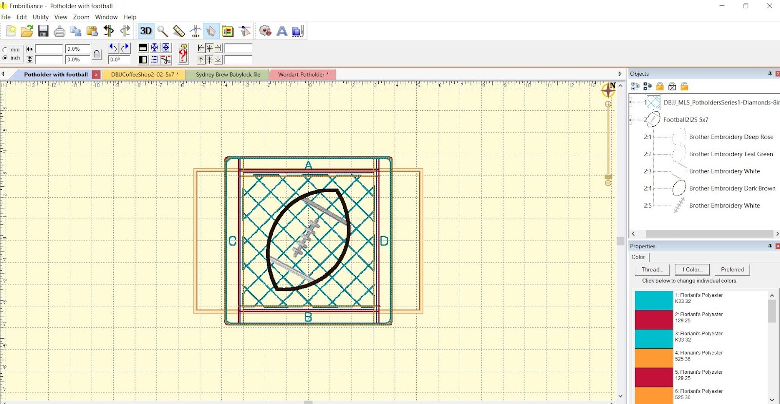 Embellishing the center of the potholders is easy with or without Embrilliance software. However, if you plan on adding a ribbon or loop, if the placement of the loop matters to you, you need to pay attention to where the ABCD edges are on the potholder. If you look at the first photo below with the Football 2 Applique, you’ll see that the A is on the top, which means the loop will be stitched on the top left of the potholder.