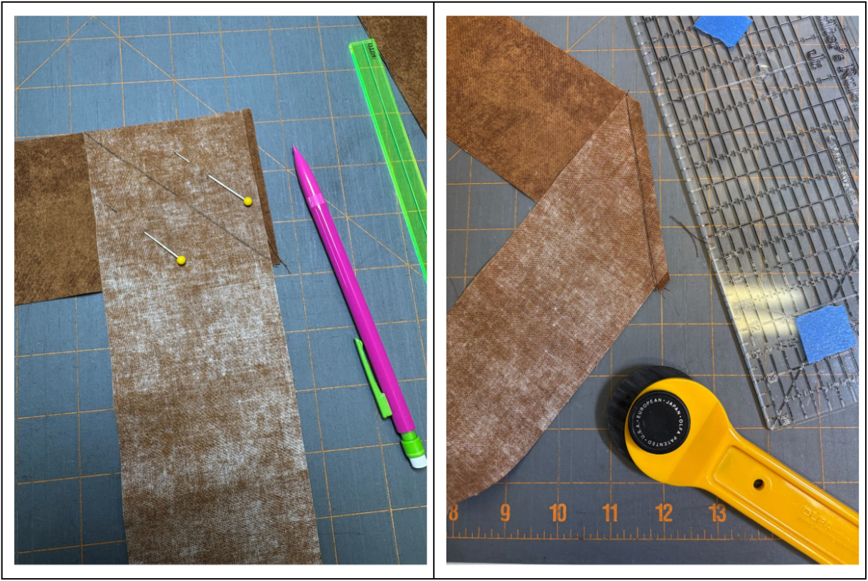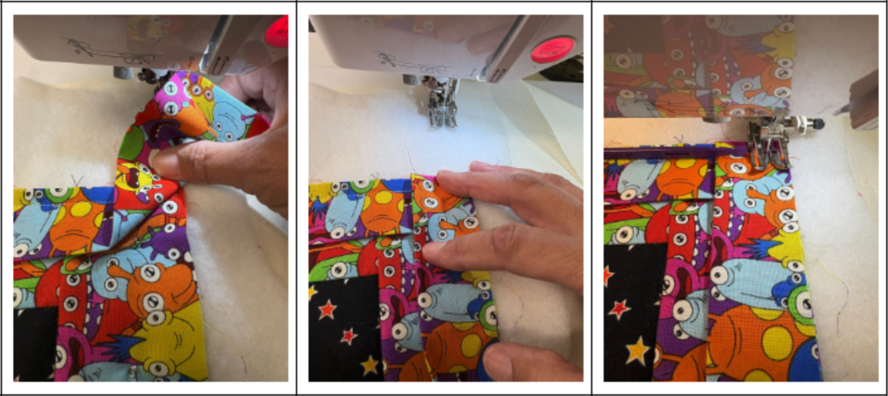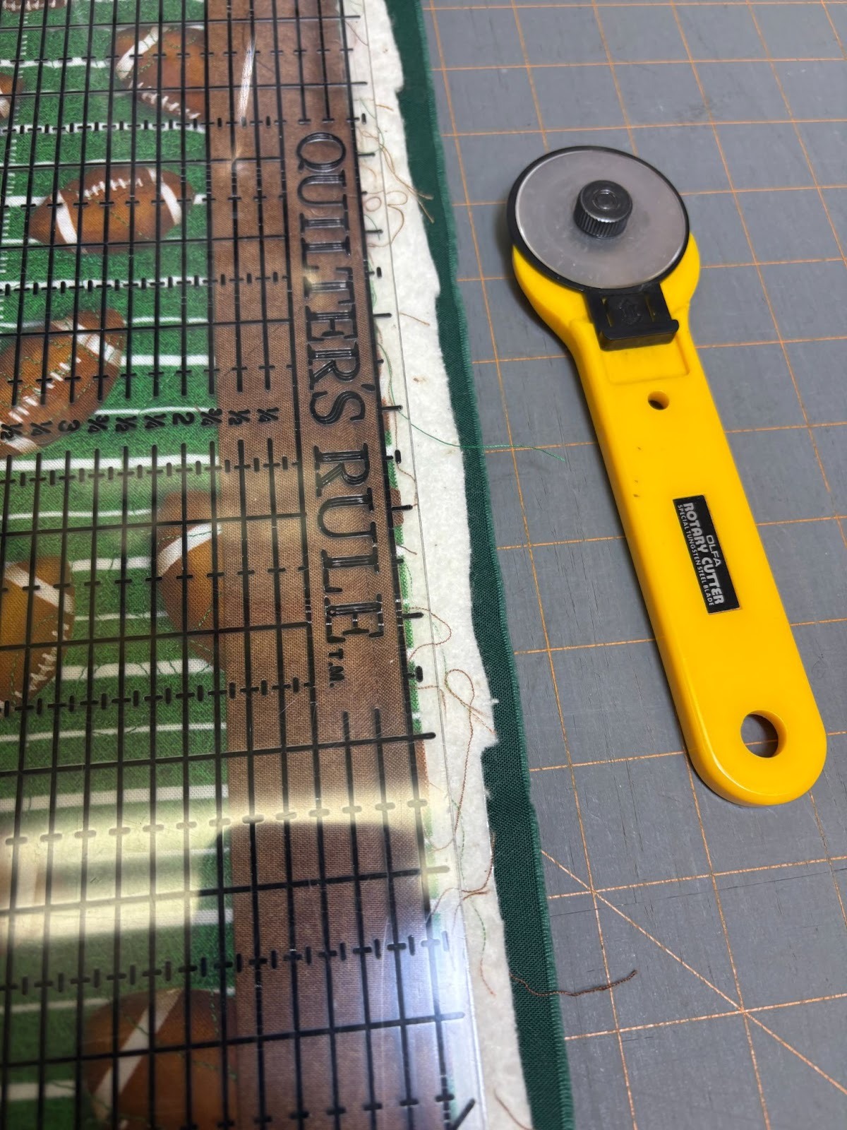 I trimmed the extra batting and backing by positioning my ruler with the ½” mark on the seam I just made and cutting with a rotary cutter.