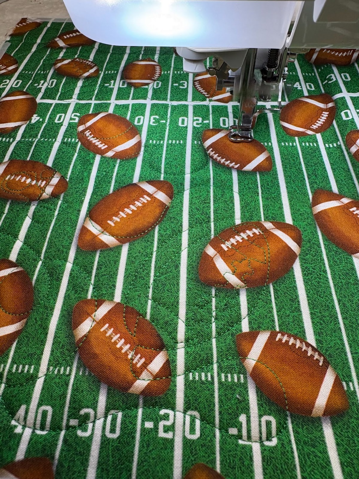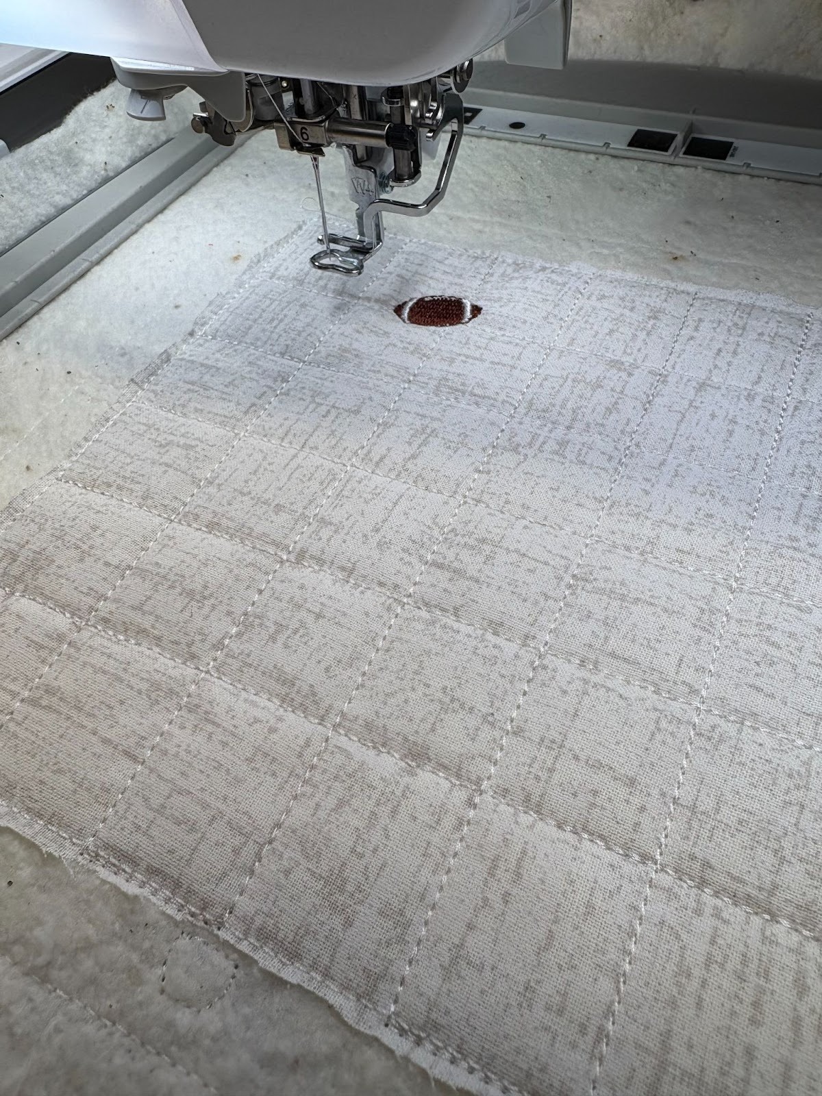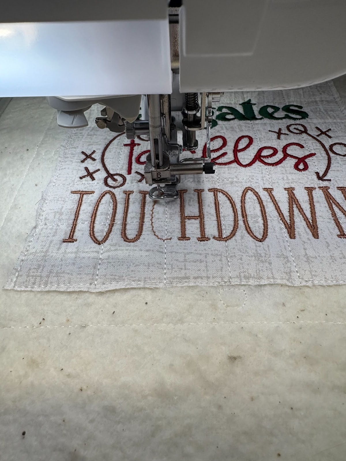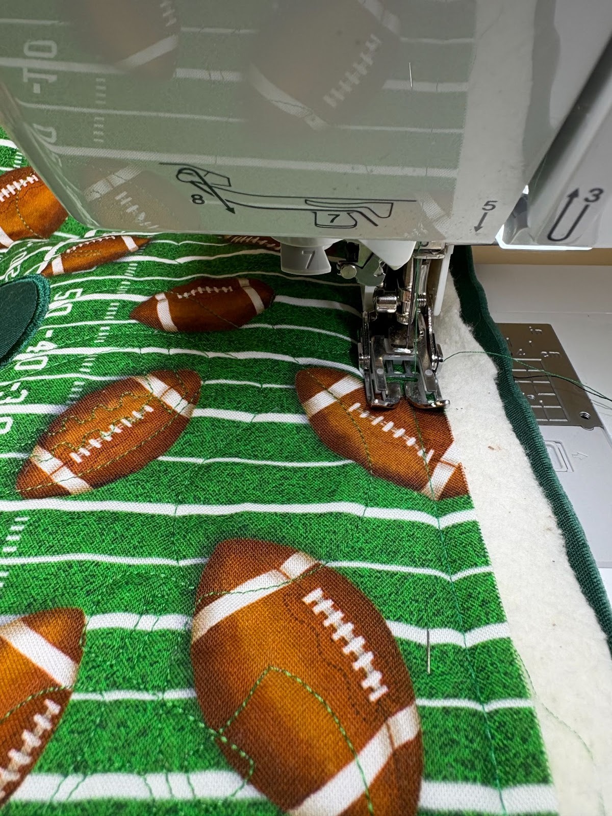 Next I jump to the steps of the design I’m adding. For my potholders this means that after the special quilting stitches were sewn, I jumped to my football designs.