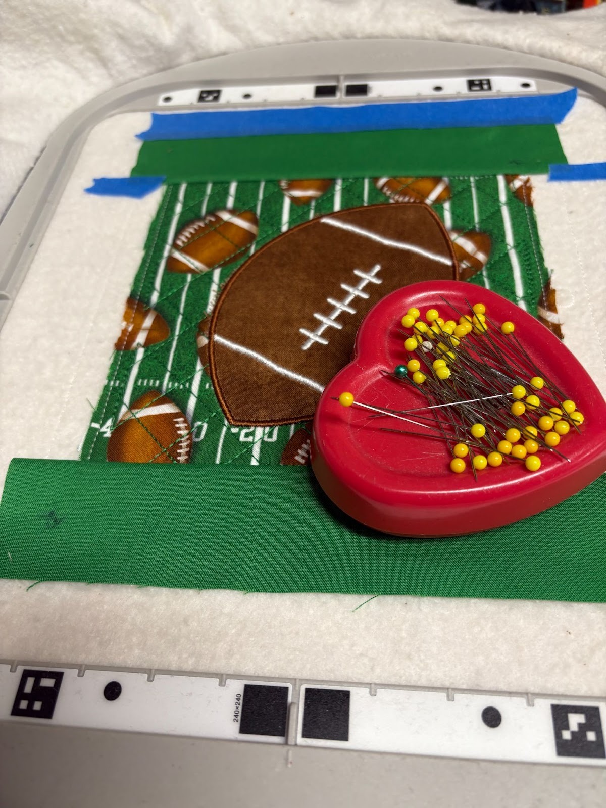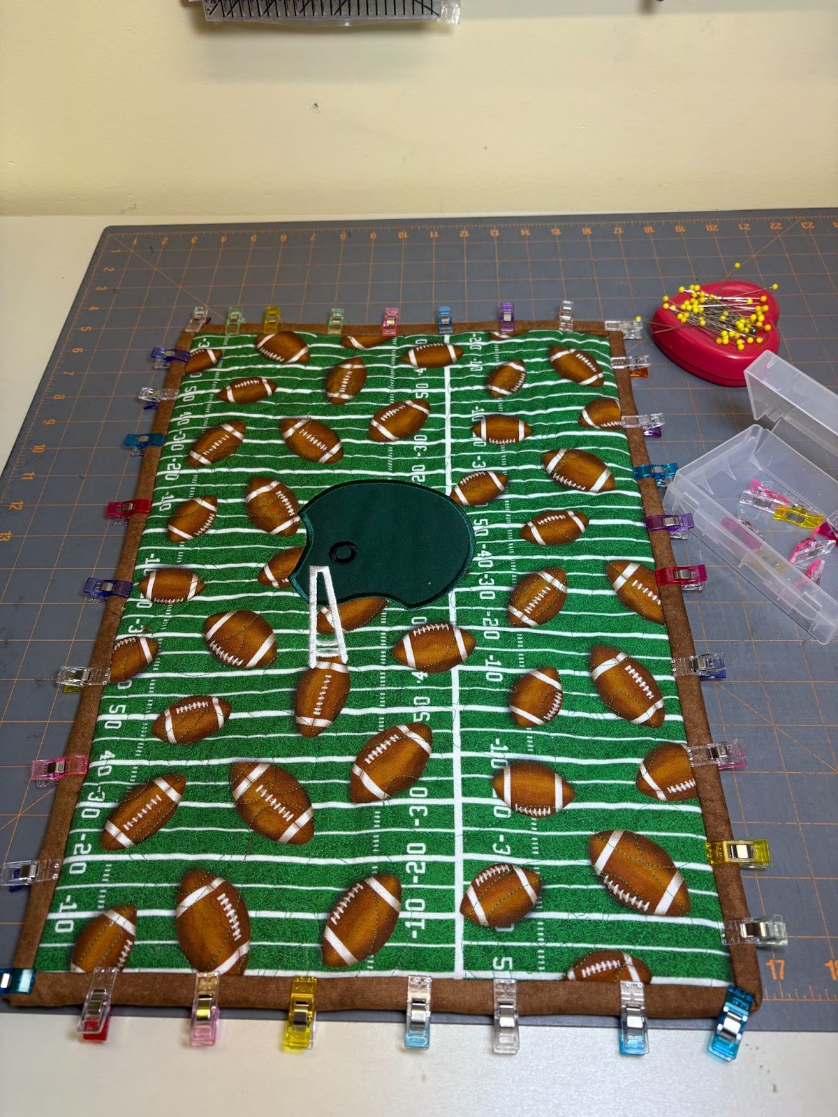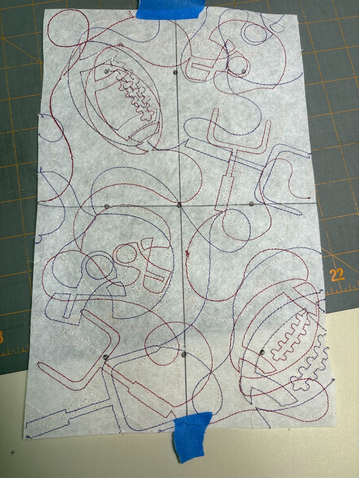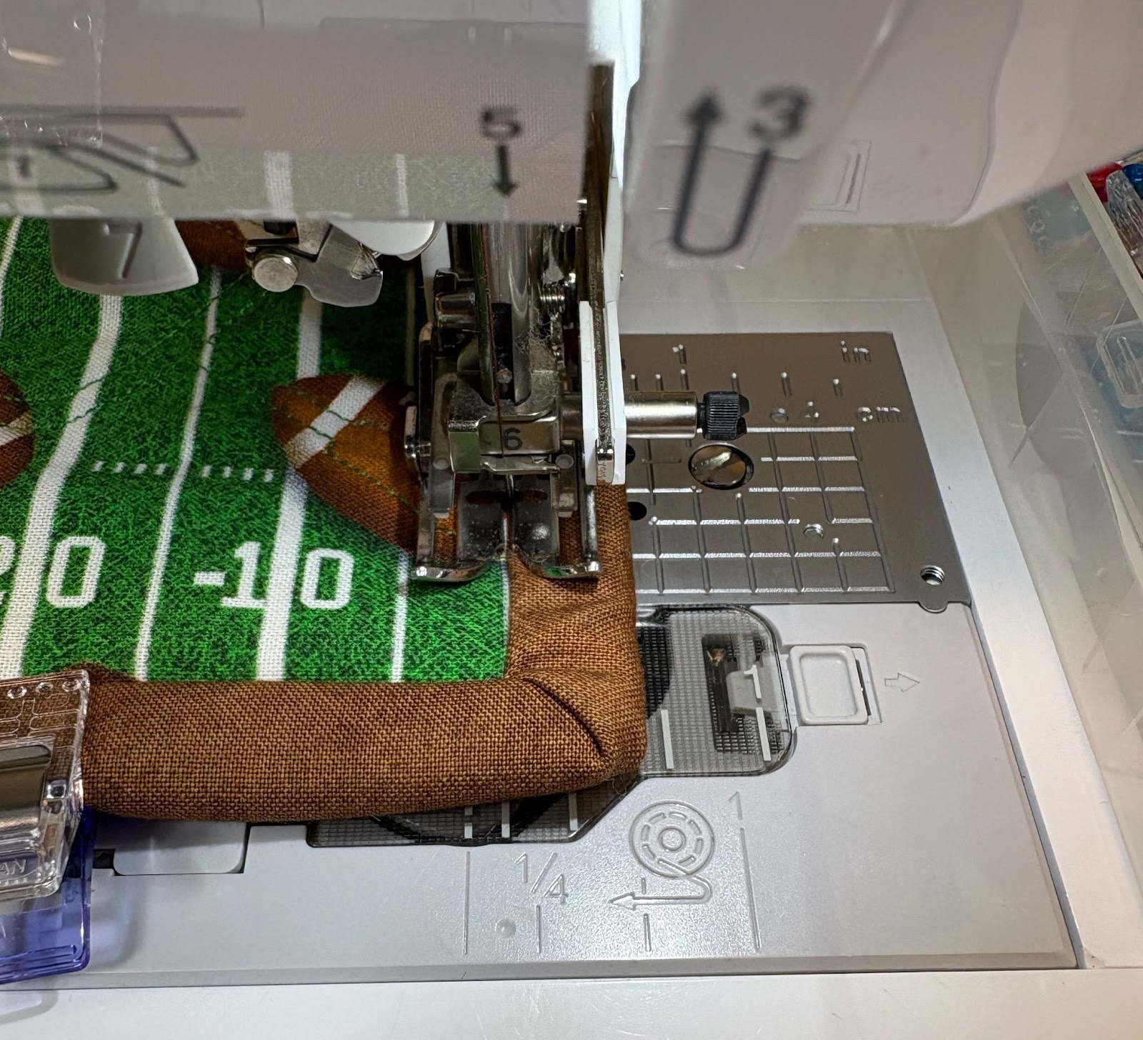Next I jump to the steps of the design I’m adding. For my potholders this means that after the special quilting stitches were sewn, I jumped to my football designs.