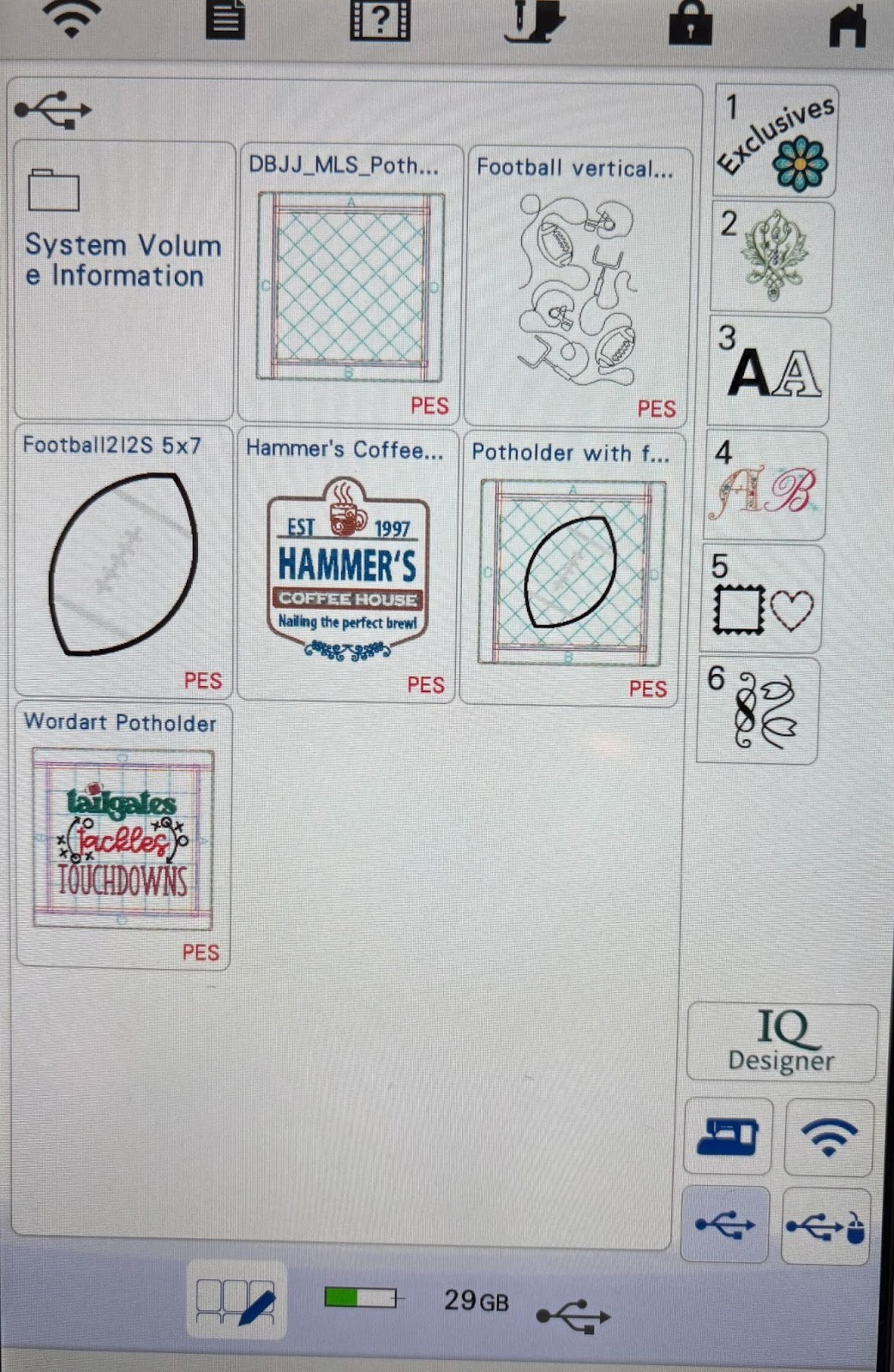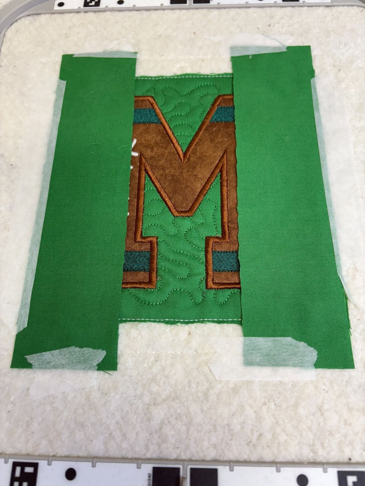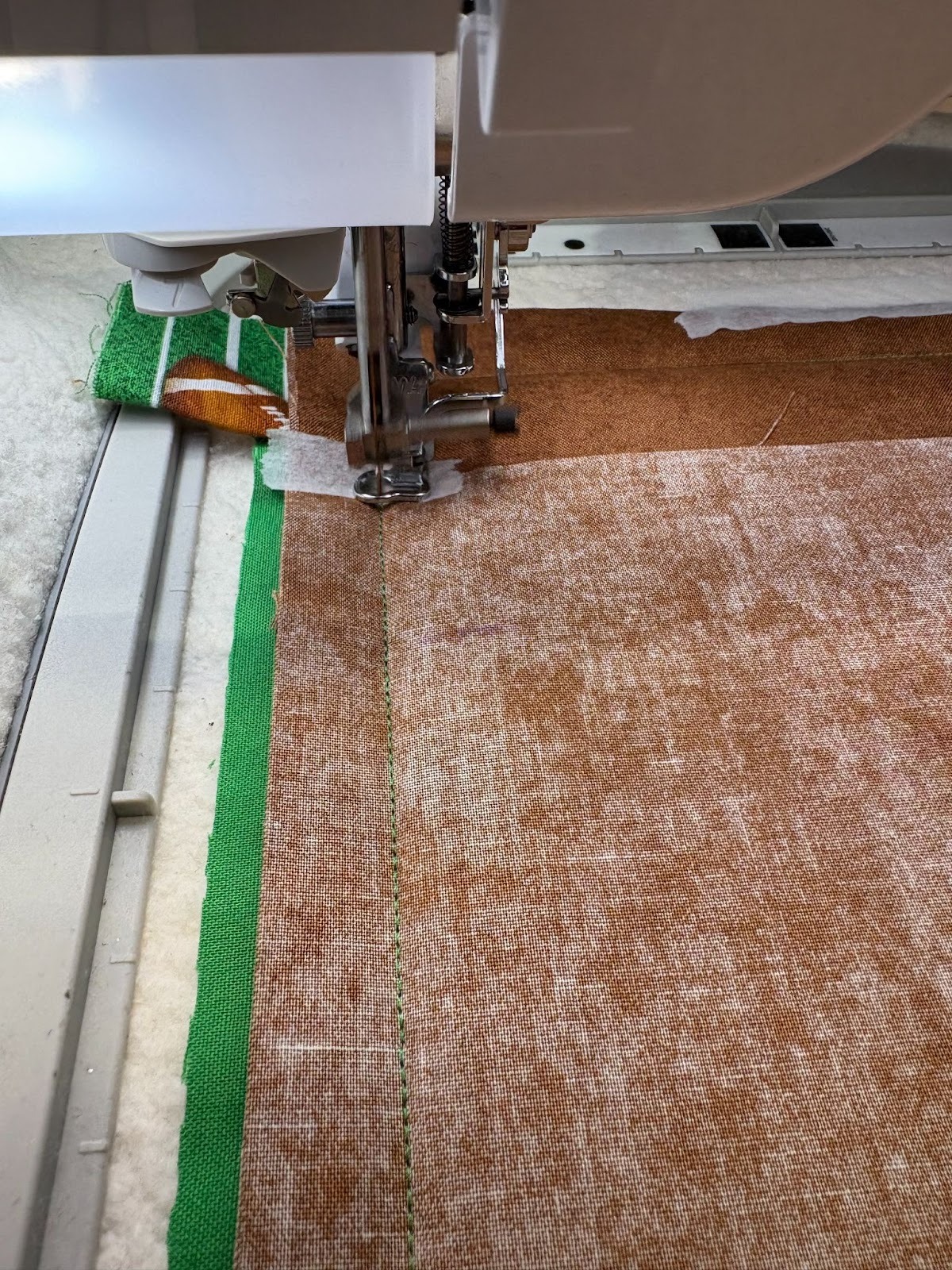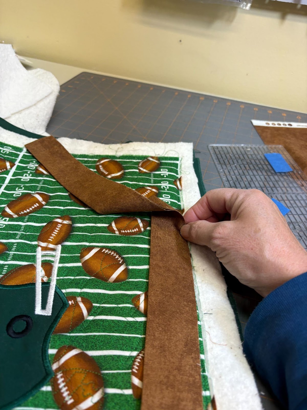 Next I jump to the steps of the design I’m adding. For my potholders this means that after the special quilting stitches were sewn, I jumped to my football designs.