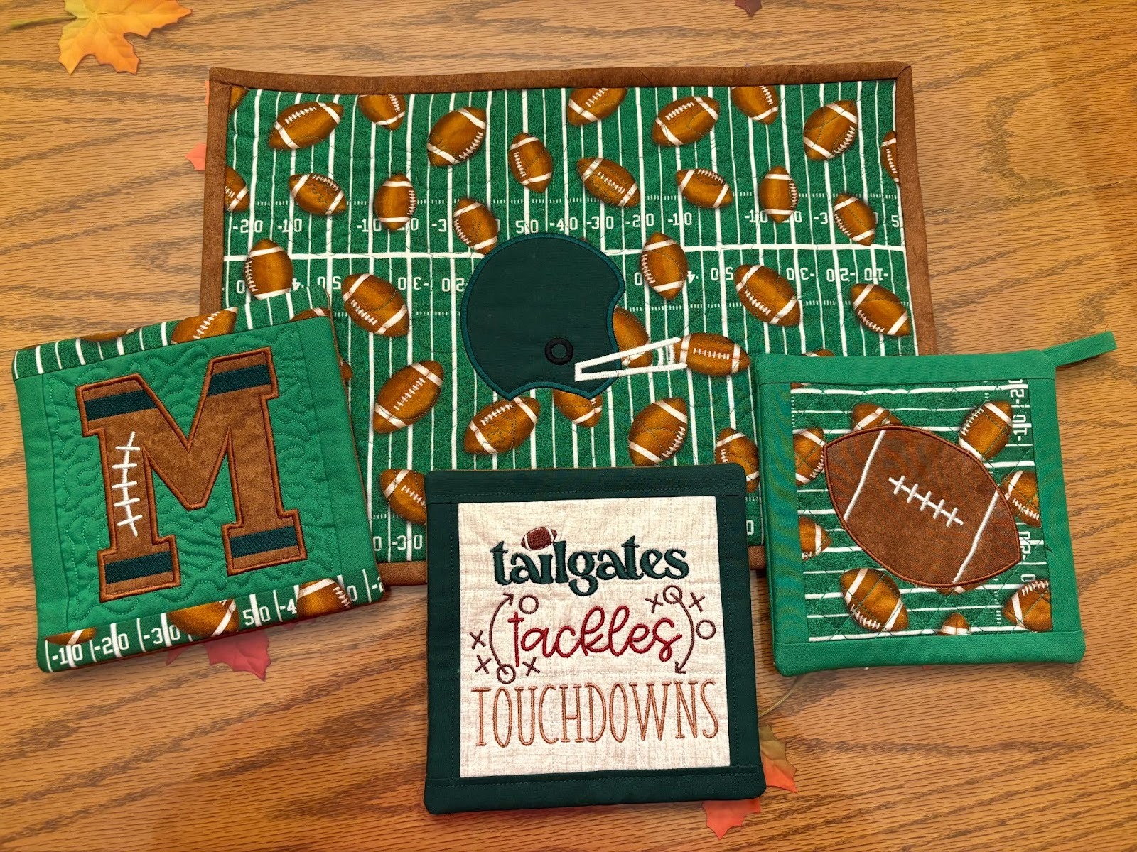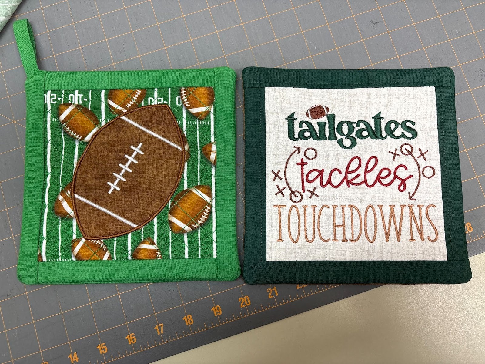 JuJu’s football designs make it so easy to get creative for game day. You can use them to stitch your own football-themed hot pads with the ITH Potholder designs, plus a quilted casserole trivet that’s sure to score a few touchdowns with your friends and family. These projects sew up quickly and make great gifts for the football fans in your life, too!