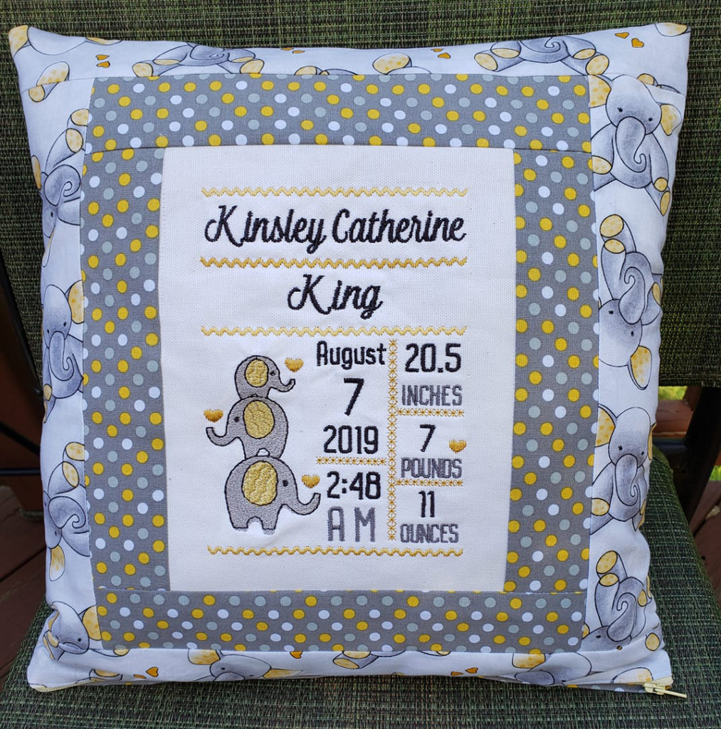 When we saw this pillow, our first thought was, "This is the perfect gift for mom AND baby!" Imagine this pillow in their nursery?? The perfect added touch! Rebecca used our Baby Elephants Birth Announcements Template to make this one-of-a-kind pillow. We love the yellow & gray combination and the added polka dots are TOO CUTE!! Great job, Rebecca, we love it.