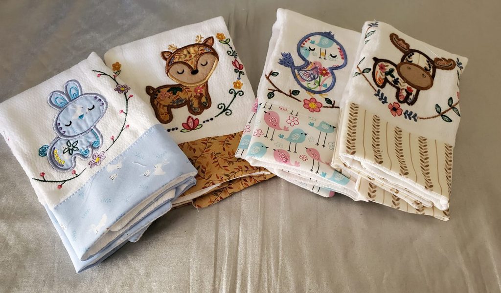 Bille used our popular Sweet Animal Laurels Set 1 and Set 2 to customize this set of burp cloths! We love all of the different fabrics & patterns she chose to use, it really helps make each one unique. Beautiful job, Billie!