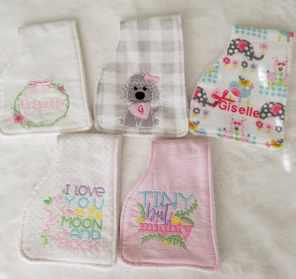 How precious are these burp cloths that Jana made?? she used our Baby Blessings 7 and Baby Blessings 8 sets, and our Dog With Valentine Girl Applique design to customize this set of 5 burp cloths for Baby Giselle. We love all of the different colors and patterns she paired together, they turned out beautifully!