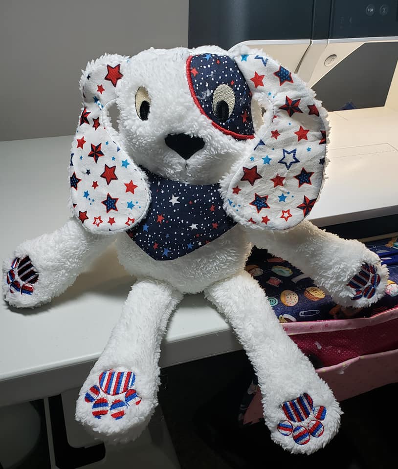 The perfect little pup just in time for the 4th of July holiday! Marianne made this adorable personalized Cute Dog Softie with fleece and red, white, and blue accents. We love her choice of fabrics for the eye and the ears, they look great together! Beautiful job, Marianne ?