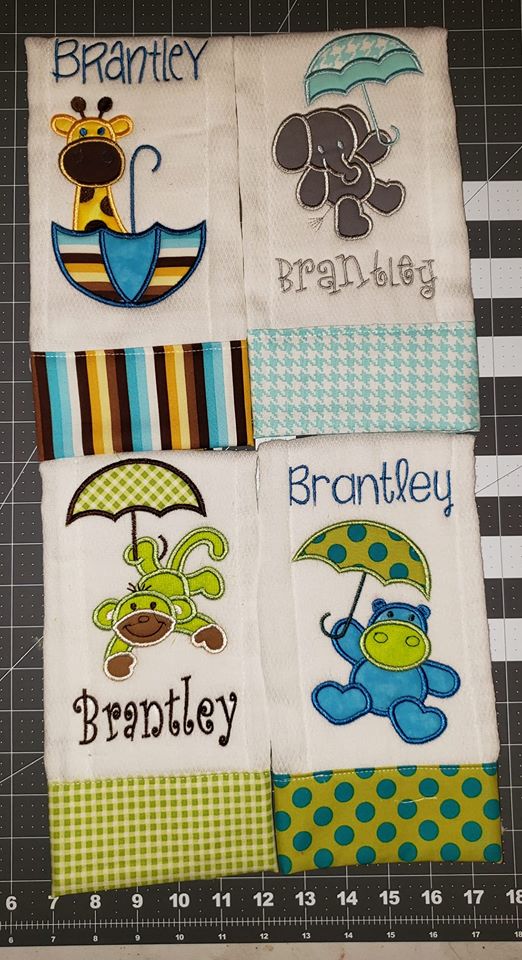 How adorable are these burp cloths that Dejuana used our Cute Umbrella Critters to make?? The colors and patterns are all so fun and bright. We especially love the added touch of the first name, the perfect addition! Great job & thanks for sharing.