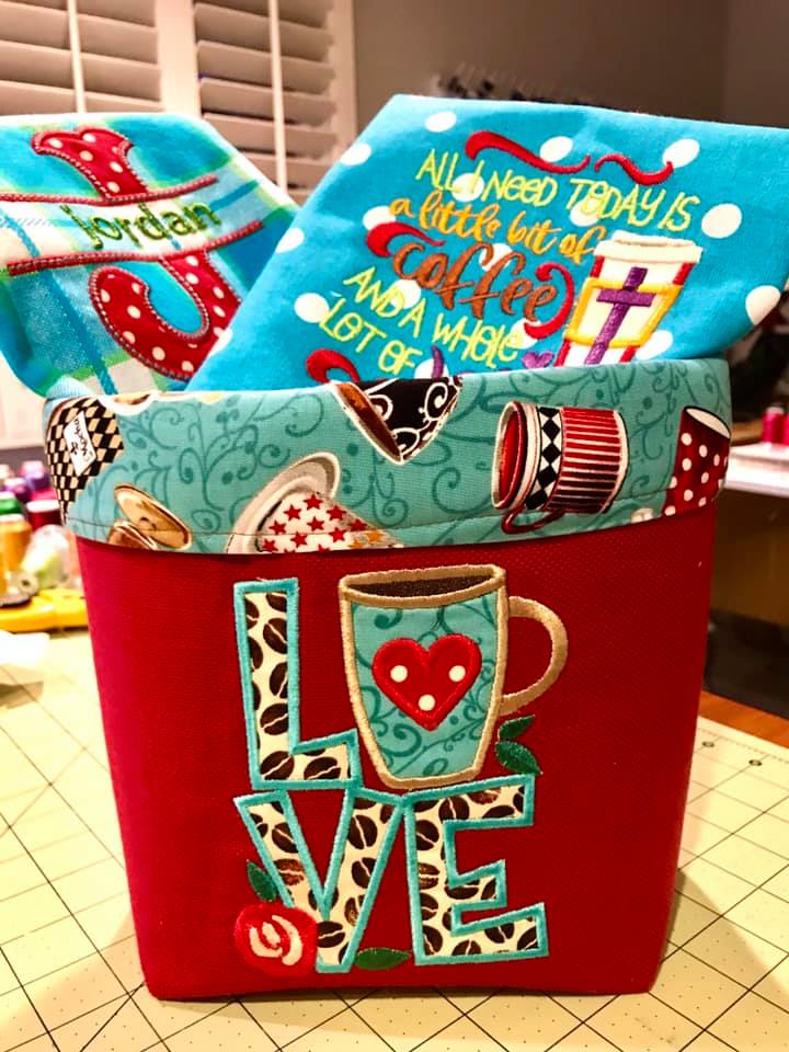 How adorable is this coffee-themed fabric basket Wanda made using our Coffee Word Art 4 set?? We love how she used a coffee-themed fabric for the inside of the basket to match our design on the front of the basket. Plus, Wanda went above and beyond & created a couple of coordinating tea towels to go along with the basket! She used our Coffee Word Art 1 & Split Wanda Applique Alphabet to create these adorable towels. We couldn’t think of a better gift for a coffee lover!