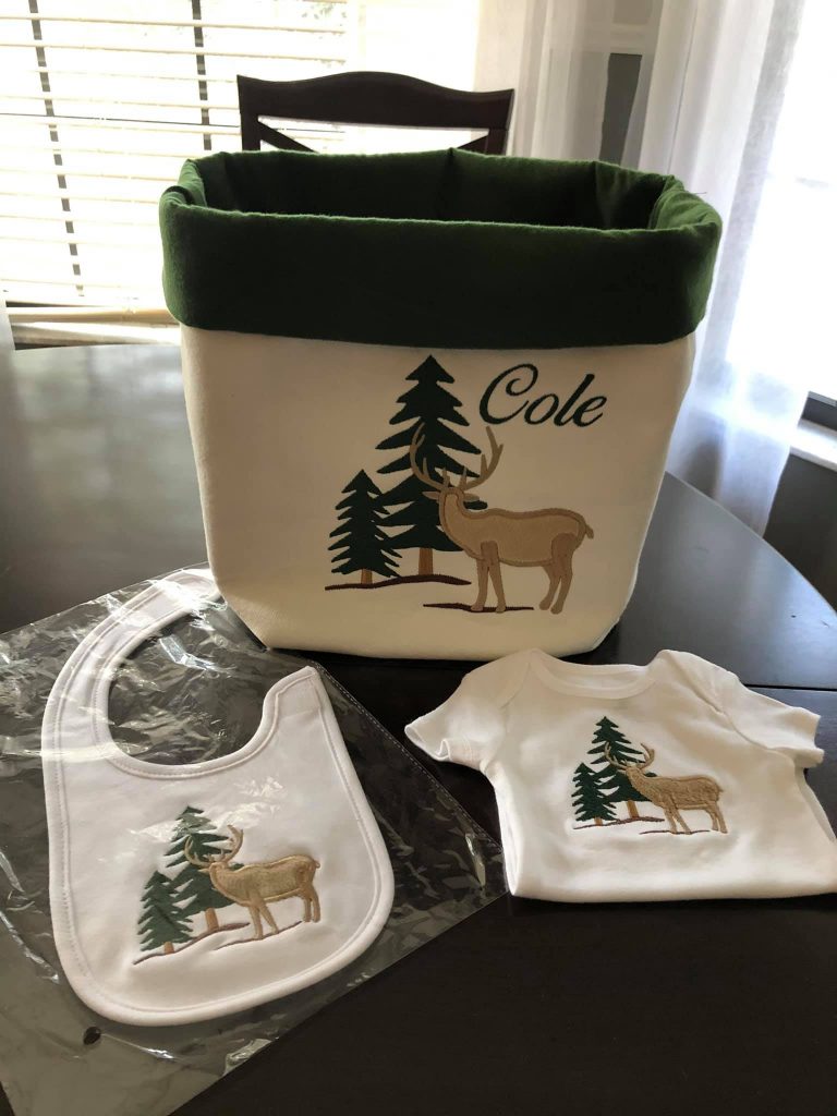 Who else thinks that Linda did an amazing job on her first fabric basket? We absolutely love how she used our Forest Silhouettes set to create this basket along with a matching bib and onesie! Linda created these matching pieces as a baby shower gift for her coworker. One of our favorite parts about this project is that Linda used matching colors for the fabric of the trees and the fabric for the inside of the basket. We hope your coworker loved these just as much as we did, Linda!