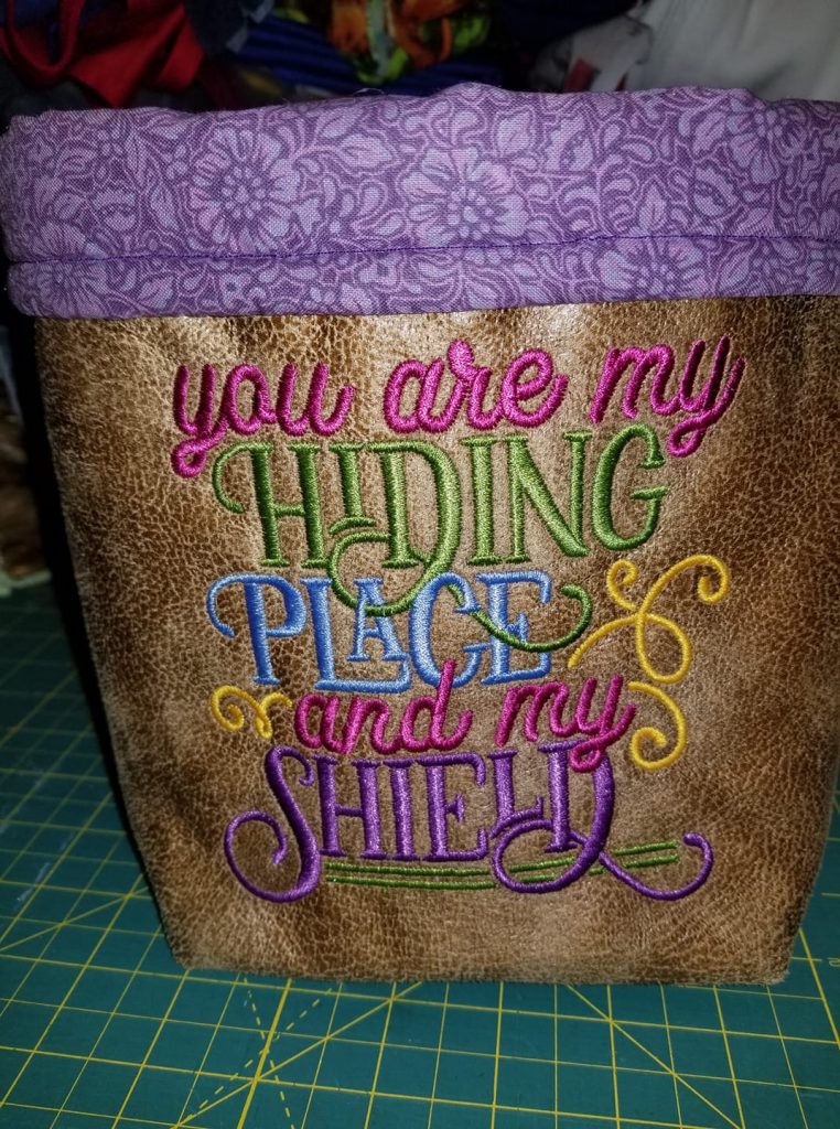 We fell in love with this project the moment we saw this photo! This is Lisa’s first fabric basket and she created it as a gift for a friend who is going through cancer treatment. From the gold exterior to the purple floral interior fabric, there’s almost too much to love about this basket! Our favorite thing about this project is how Lisa incorporated our Bible Blessings 2 onto the front of the basket. The colors she chose for our design perfectly compliment the rest of the basket and we love its heartwarming message. Wonderful job, Lisa!