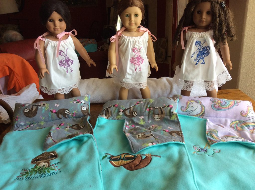 How cute is this?? Ruthann used our designs to create these precious doll nightgowns & sleeping bags for her great-nieces! We absolutely LOVE the colors and applique sets she chose for each sleeping bag and the ballerinas look beautiful on the white nightgowns. This is such a creative gift for a little girl who's looking for new doll accessories to play with! Ruthann used our Be Kind Critters Applique 3, Critters With Glasses, and our Unicorn Animal Faces for the sleeping bags and our Mehndi Ballerinas 1 and Mehndi Ballerinas 2 for the nightgowns. Beautiful job, Ruthann!