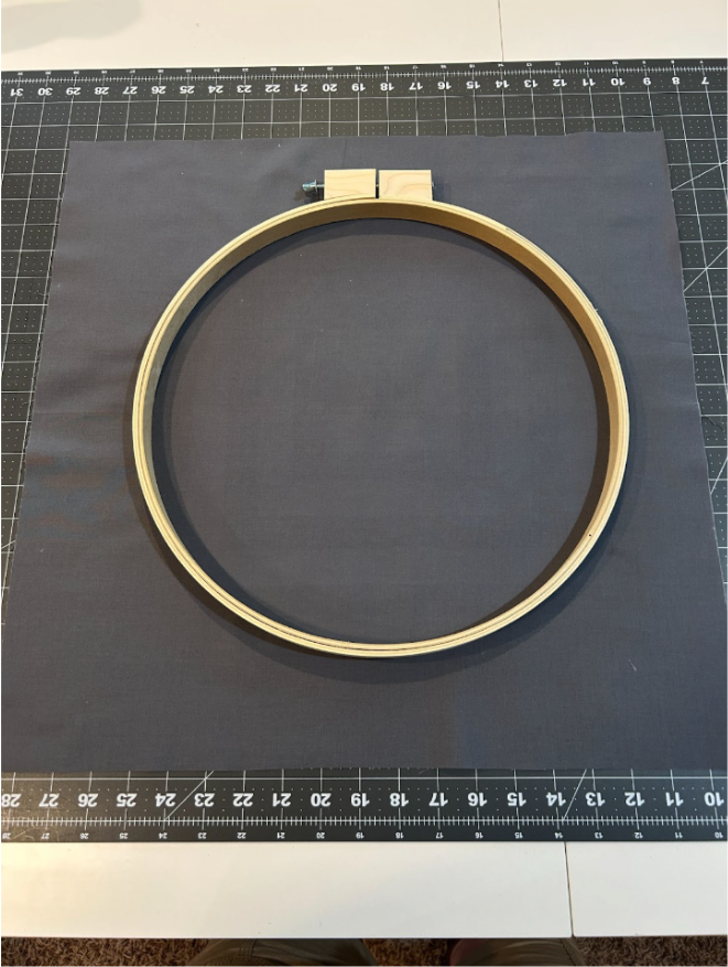 For my 14” clock I wanted to be sure I had plenty of fabric, so I placed my wood hoop and cut out a large square with at least 3” beyond the hoop.