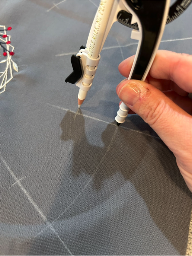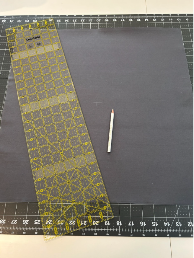 Take your fabric back to your workspace to find the center of the fabric. I used my long ruler and, using my water-soluble pencil, I drew a + sign in the middle. This is the point that I will be using to make the rest of my placement marks. It’s always a good idea to test your pencil on a small scrap or edge piece of fabric to ensure it will disappear easily. I’d hate to do all this work and have the lines not disappear!