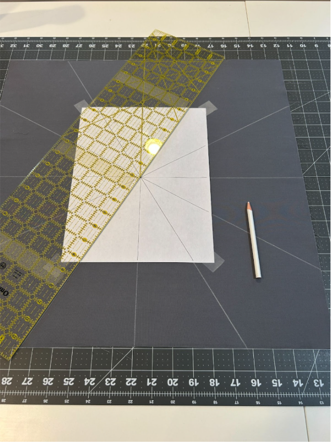 Using your long ruler, extend the lines from the template out onto the fabric.
