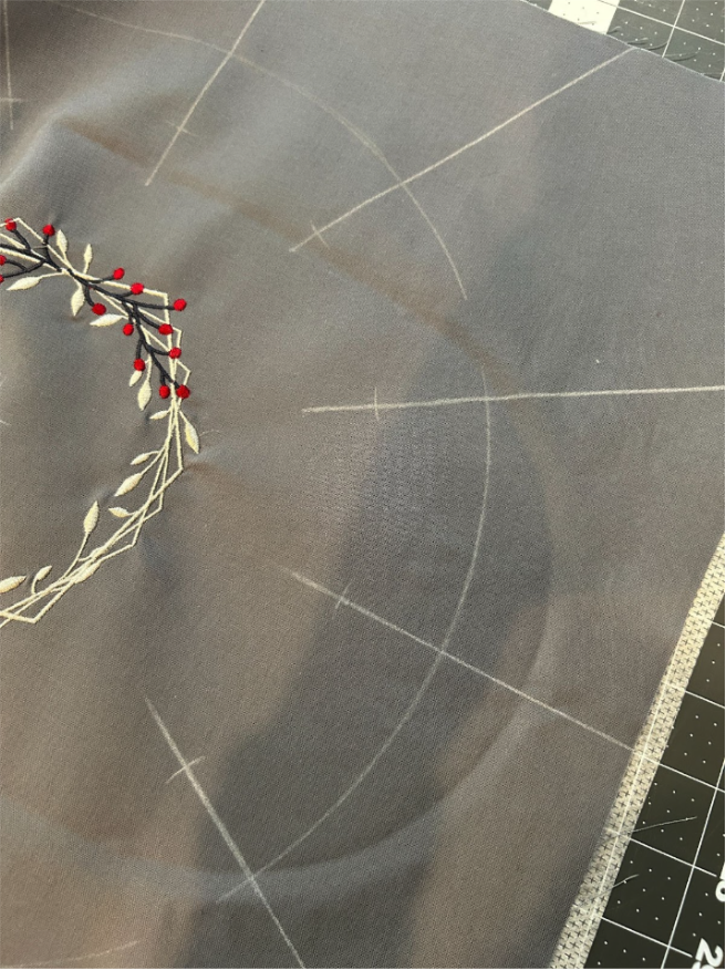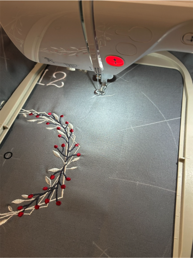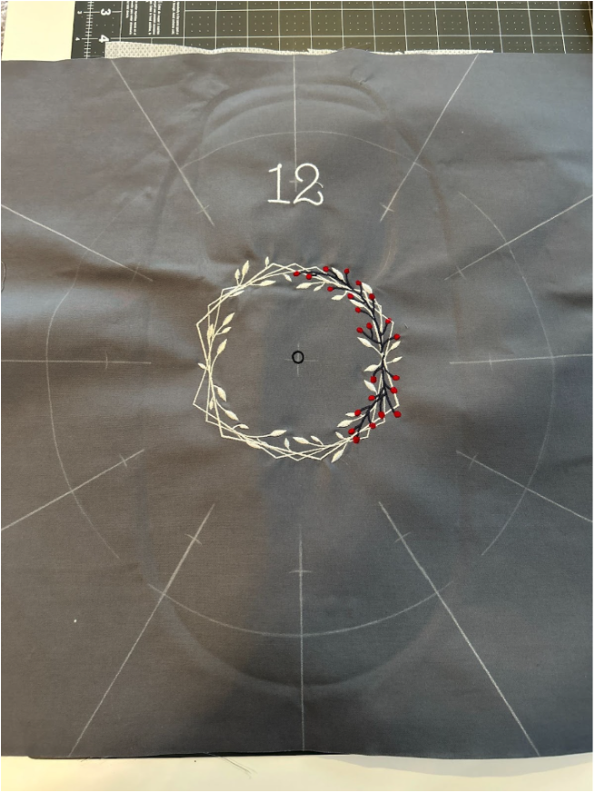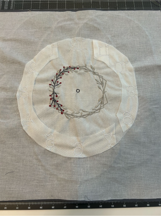After this you can stitch out a design for the center of your clock. I chose a wreath design but other things would definitely work. I ensure everything is centered around that center point in the design.
