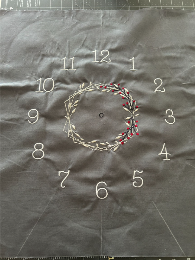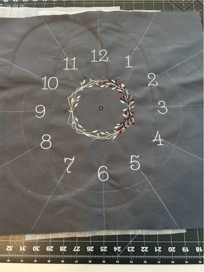 To do a few numbers at one time we need to use a larger hoop. I made sure the hoop was vertically lined up with the 12–6 o’clock line. But I didn’t worry about lining anything up with the actual number placement marks.