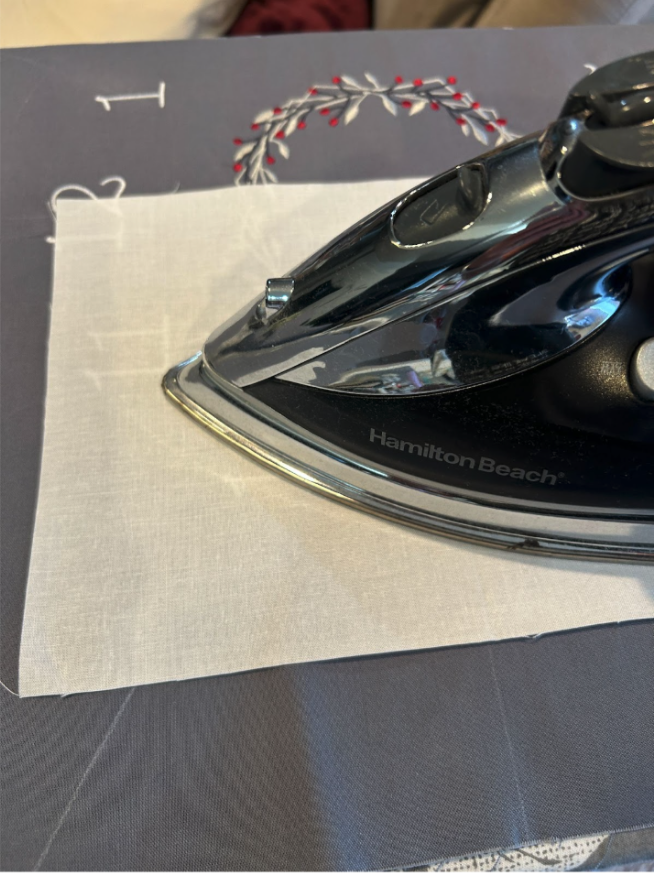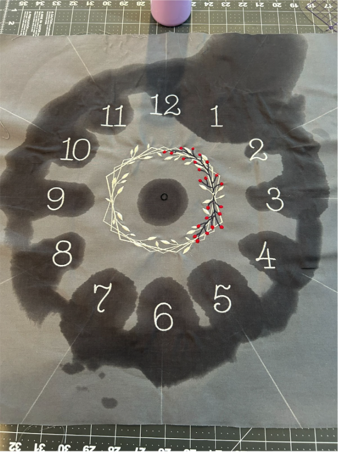 At this point we can remove the white line marks on the fabric. We don’t want to use our iron to press the fabric until the lines are removed or they may not disappear. I used a wet rag and dabbed at all the marks. I didn’t try to remove all of the lines, only out to the perimeter of the clock. Anything left on the fabric outside the circle will be in the back. Then I left it to air dry.