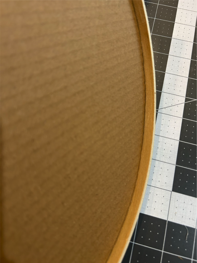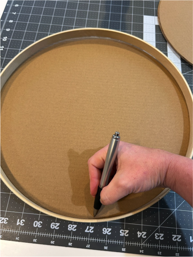 The cardboard for your clock needs to fit just inside the inner hoop. The 14” cake round I bought was slightly too big, because the outside of my hoop is 14”. So I traced my inside my inner hoop on the cardboard.