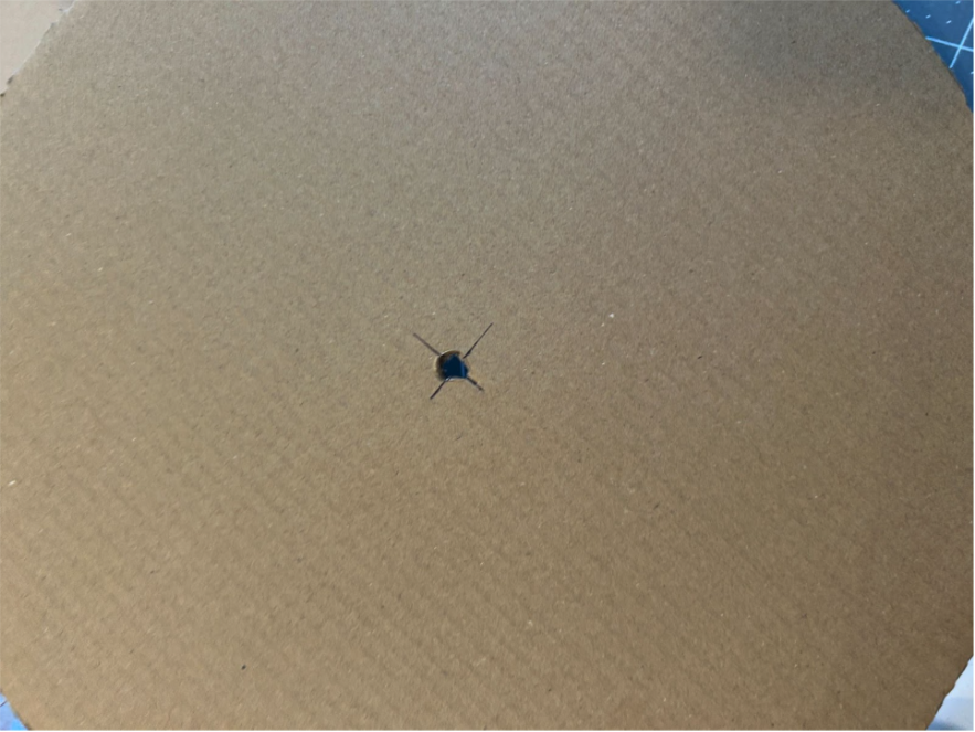 Make a hole in the center of the cardboard. I used a small awl to make the hole and then I enlarged it by sticking one blade of my scissors in (not my fabric ones, of course) and rotated the blade.