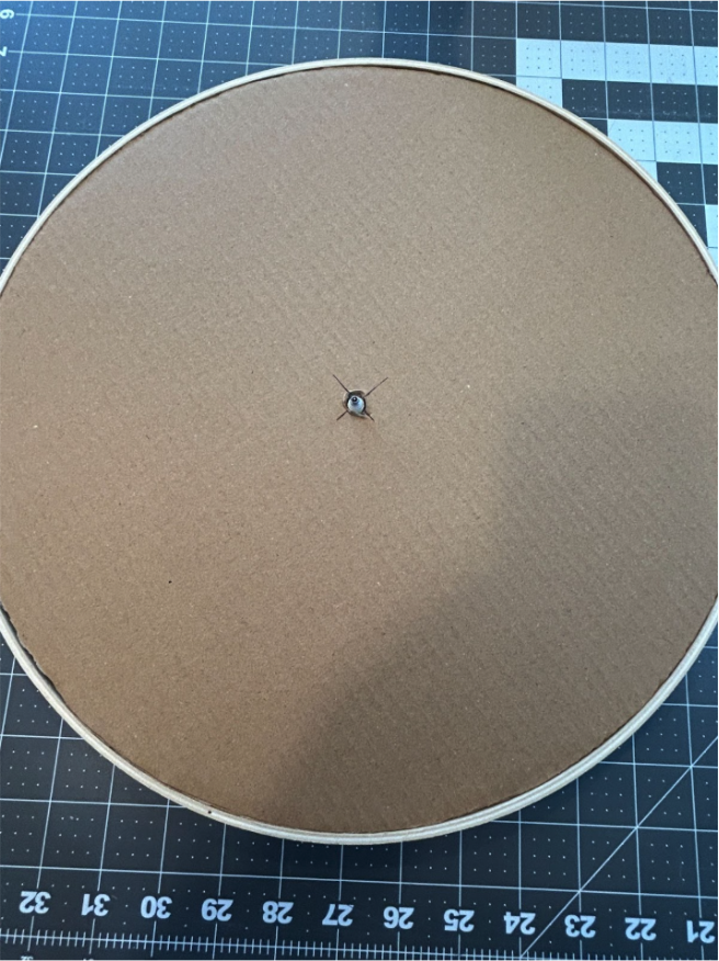 Insert the cardboard piece into the inner hoop and then place that over the clock mechanism with the shaft coming through the center hole.