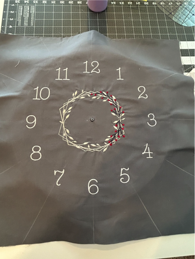 I wasn’t sure what size numbers I wanted to use in my clock. Neither was I sure if I wanted white or black numbers. So I stitched out some numbers in the 2”, 1.5”, 1.25”, and 1” sizes. I stitched them out on matching scrap fabric and cut them out, then I placed them around the clock to decide what I wanted.