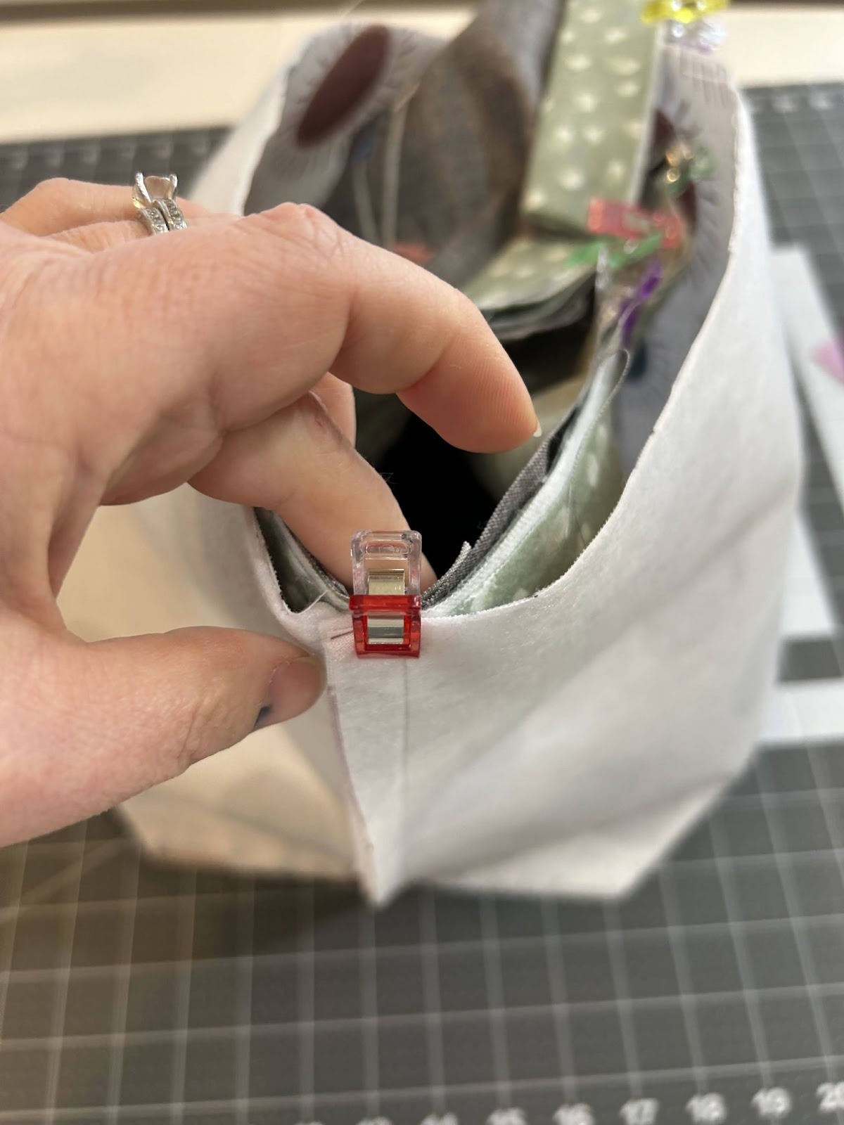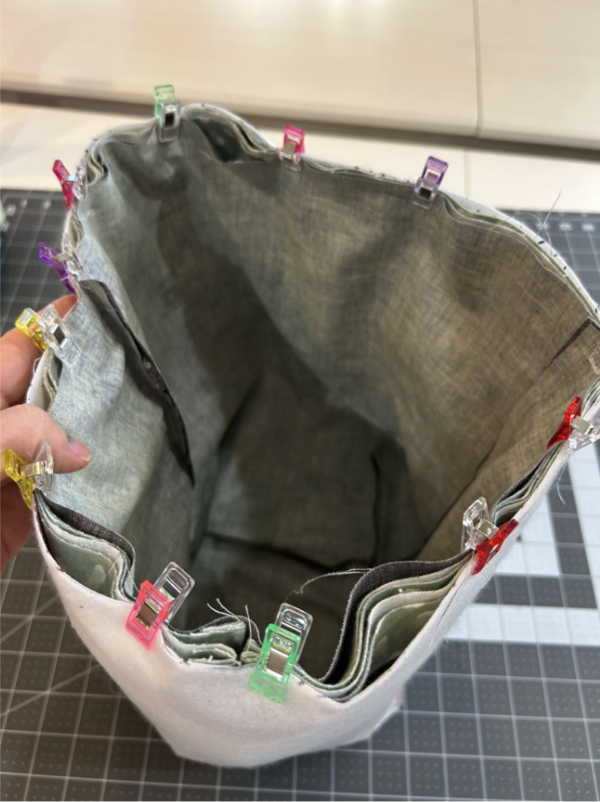 Start by lining up the side seams and clipping them together, making sure the top raw edges of the lining, cover, and drawstring casing are all lining up.