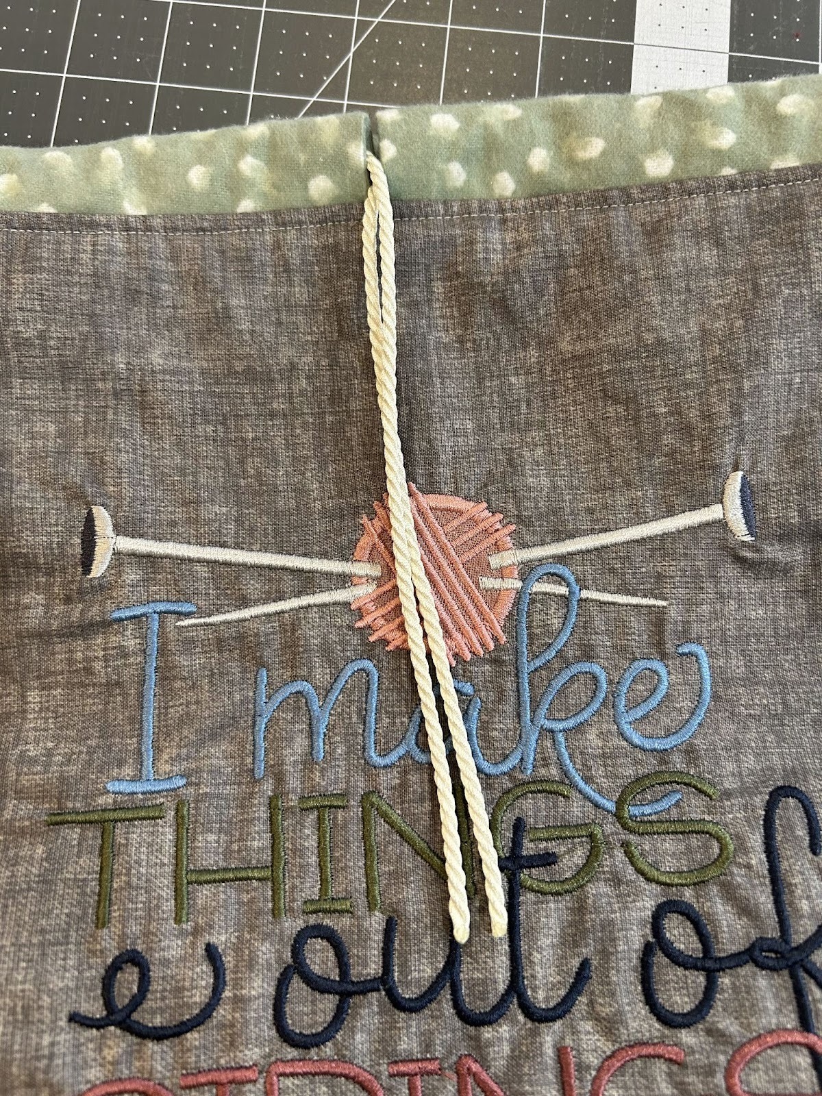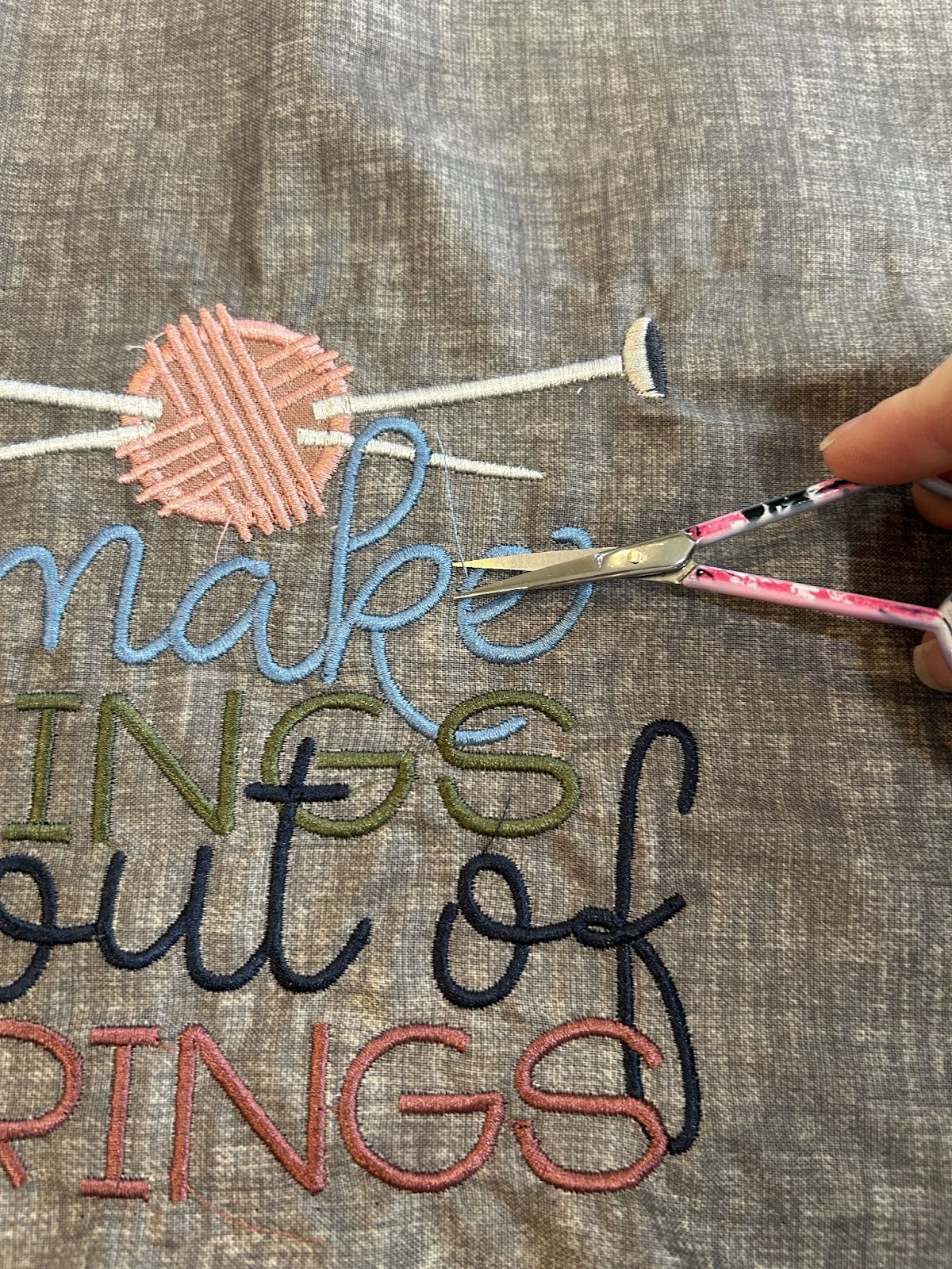 Embroider your design. Follow your color chart for the exact steps, to change threads, and to do any applique on the project. My design had one small piece of applique behind the yarn ball.